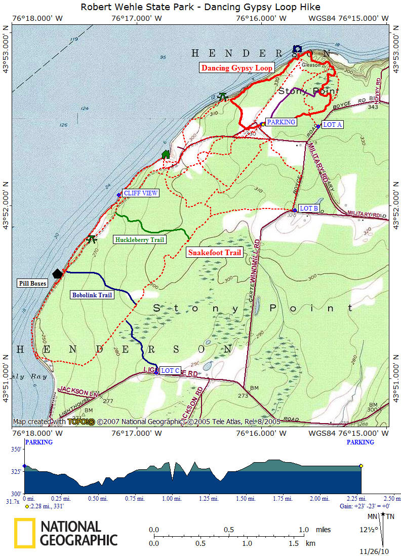 This loop hike turns right onto the Dancing Gyspy Trail (or straight ahead from the picnic area/overlook). There are views of Lake Ontario as you walk along the mowed trail. Be careful as there are, at times, cliffs on your left. At 1.0 miles you'll reach a park service road. Turn left and soon pass by an enormous old artillery wall from World War II when this property was owned by the US Army. A few feet further is an open area on your left with a small concrete pill box on the top of cliffs, about 150 feet above Lake Ontario.