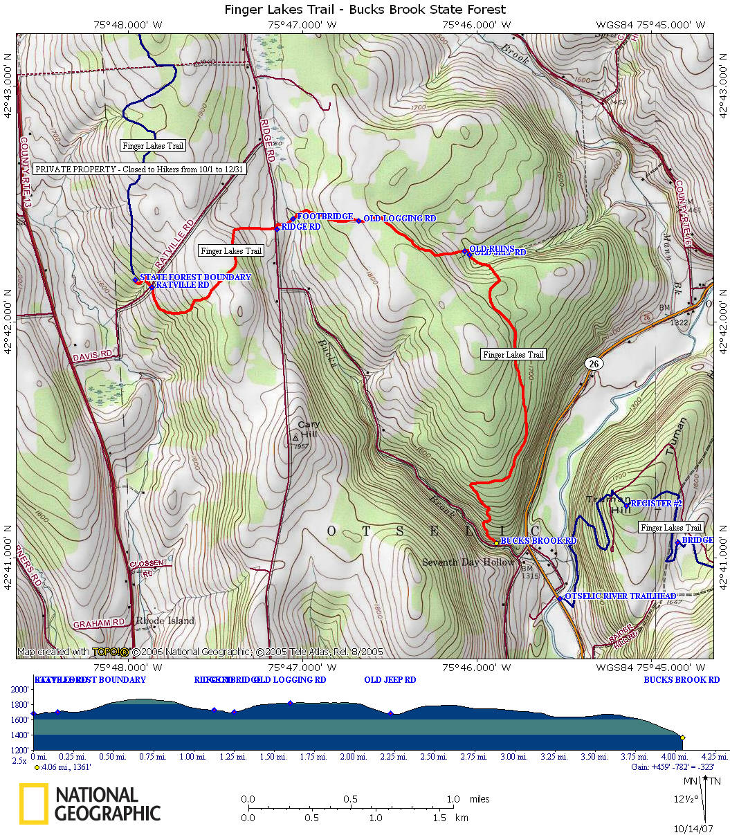 Mile Elevation Finger Lakes Trail Description 0.0 1684 feet Bucks Brook State Forest Boundary. North of this point the FLT runs through PRIVATE PROPERTY. It is closed by the landowner to hikers for HUNTING from 10/1 to 12/31. Follow white blazes.