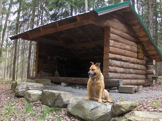 Scrappy hangs out in front of the Perkins Pond Lean To