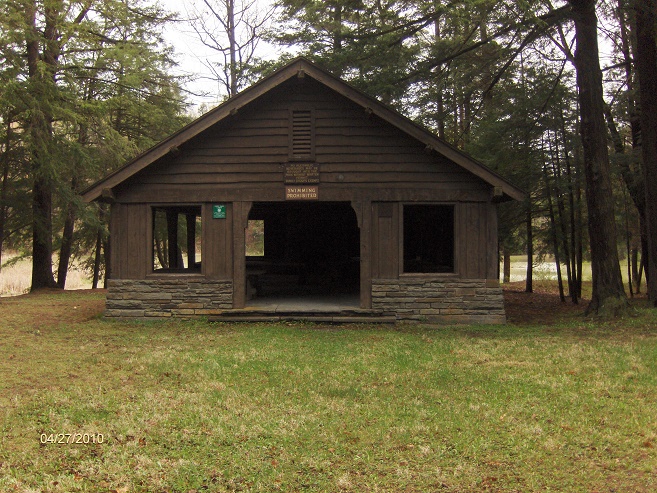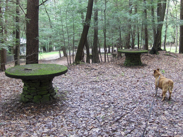 At 1.9 miles the trail reaches a junction of trail that leads to the South Park Entrance and the park campground. The trail veers left at this junction and descends steeply into an old picnic area. Check out how they constructed the picnic tables and the nice old grills. There is an old rest room facility on the left that is closed. The trail is hard to follow through here as the trail heads toward a park maintenance road.