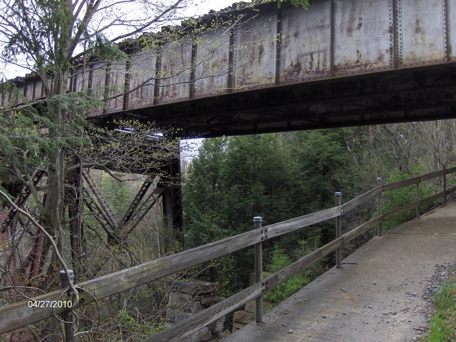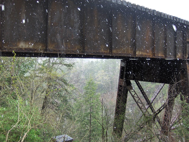 At 1.25 miles you reach the amazing Norfolk Southern Railroad bridge that spans the gorge. This is an active railroad and there are posted signs meant to keep people of the bridge. Scrappy wanted to explore the bridge, however I knew better and with the snow really flying we continued on.