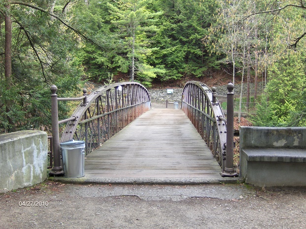 At 2.15 miles you reach an open area with a pond toward your right, the south pavilion on a hill on your right and a stone display on your left. The display talks about the trails in the area and the old park. The FLT/NCT continues straight here toward NY 329 and the village. We turned left and followed a trail to the suspension bridge at 2.2 miles. From this point my options were very limited as all the trails in this area had signs stating NO DOGS ALLOWED. Poor Scrappy.