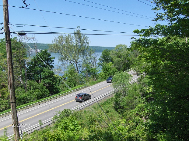 The trail comes into an opening near power lines and you'll notice busy NY 414 below as well as a few views of Seneca Lake. If you look toward the south you'll see Clute Park. The trail winds back into the woods and passes a trail register. The trail travels next to a rock cliff before reaching the side of busy NY 414 and the end of this part of the hike.
