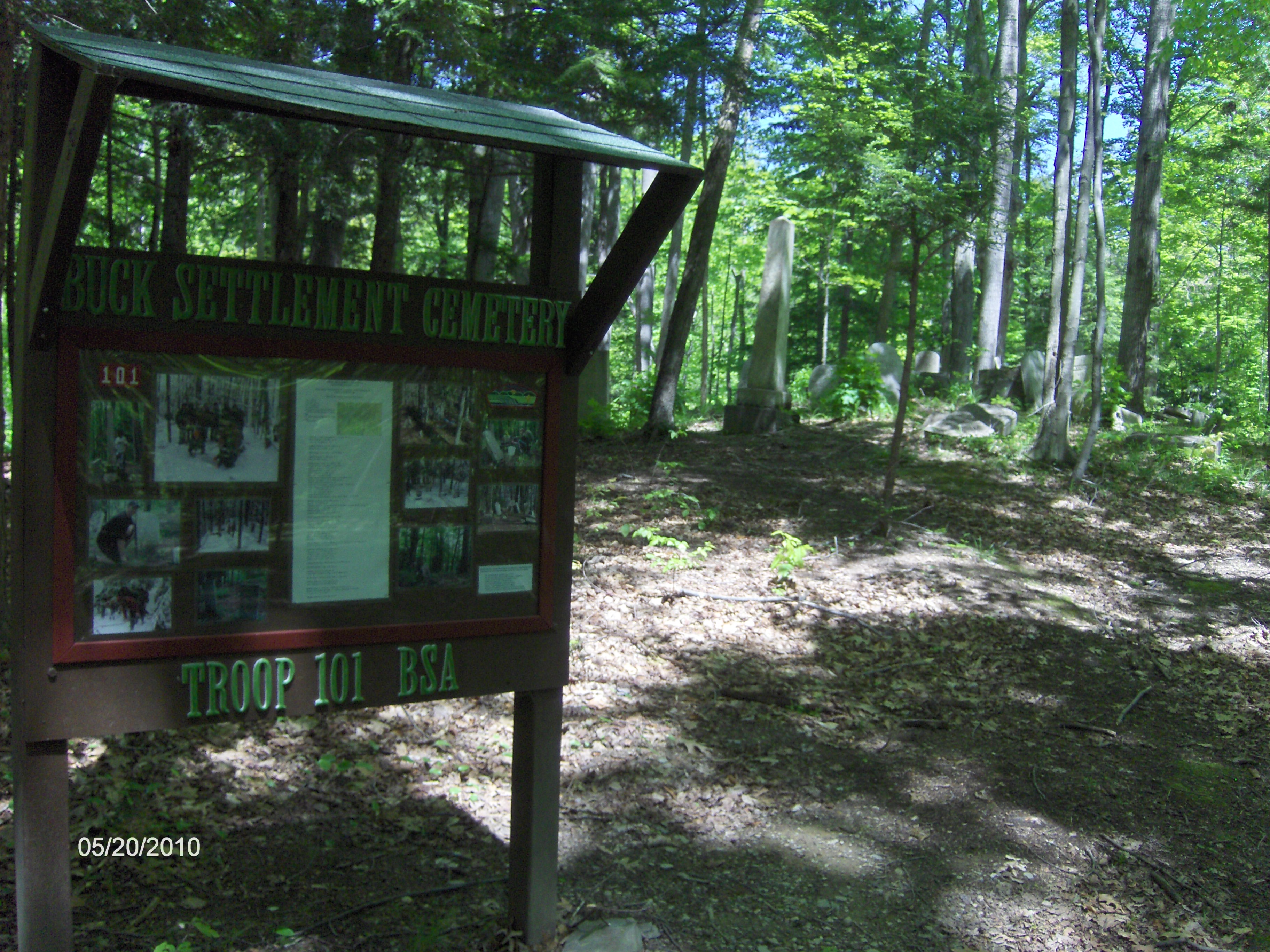 Continue your hike following the white blazes as you are back on an old road with a ditch for water on the right. As you climbed gently, did you notice the remains of an old building on your left? After the trail levels off there is a side trail on the right that leads to a kiosk of the old Buck Settlement Cemetery at 0.2 miles. This old cemetery was saved by a local boy scout troop. At 0.3 miles reach a junction where the trail turns right and enters private property briefly.
