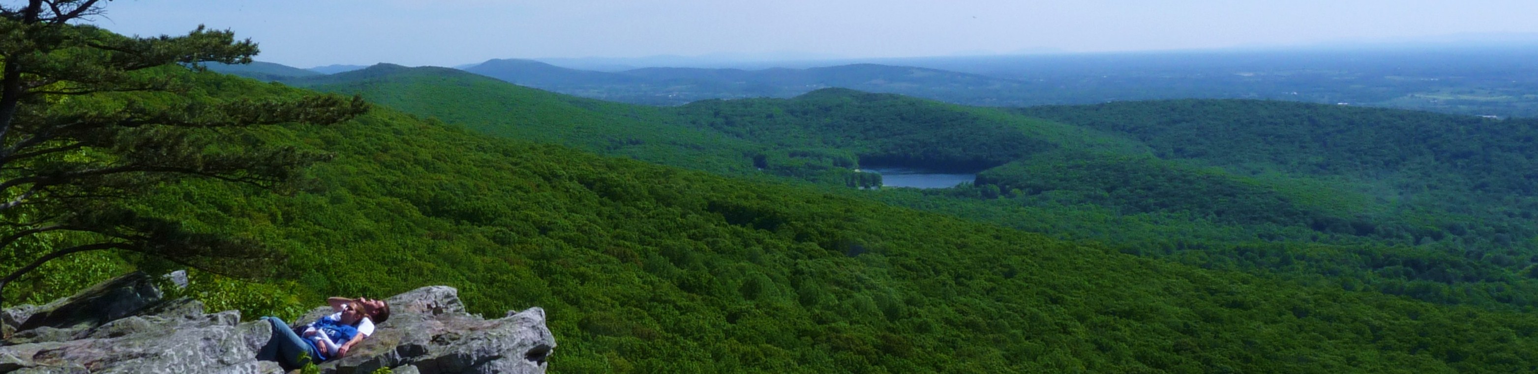 At 0.8 miles the trail travels to the west of the summit of Pine Knob. At 2.1 miles a blue blazed trail on the left heads 0.25 miles to Annapolis Rocks, an overhanging cliff with spectacular views to the west. There are several primitive campsites in the area. There are also a couple of privies at this popular destination.