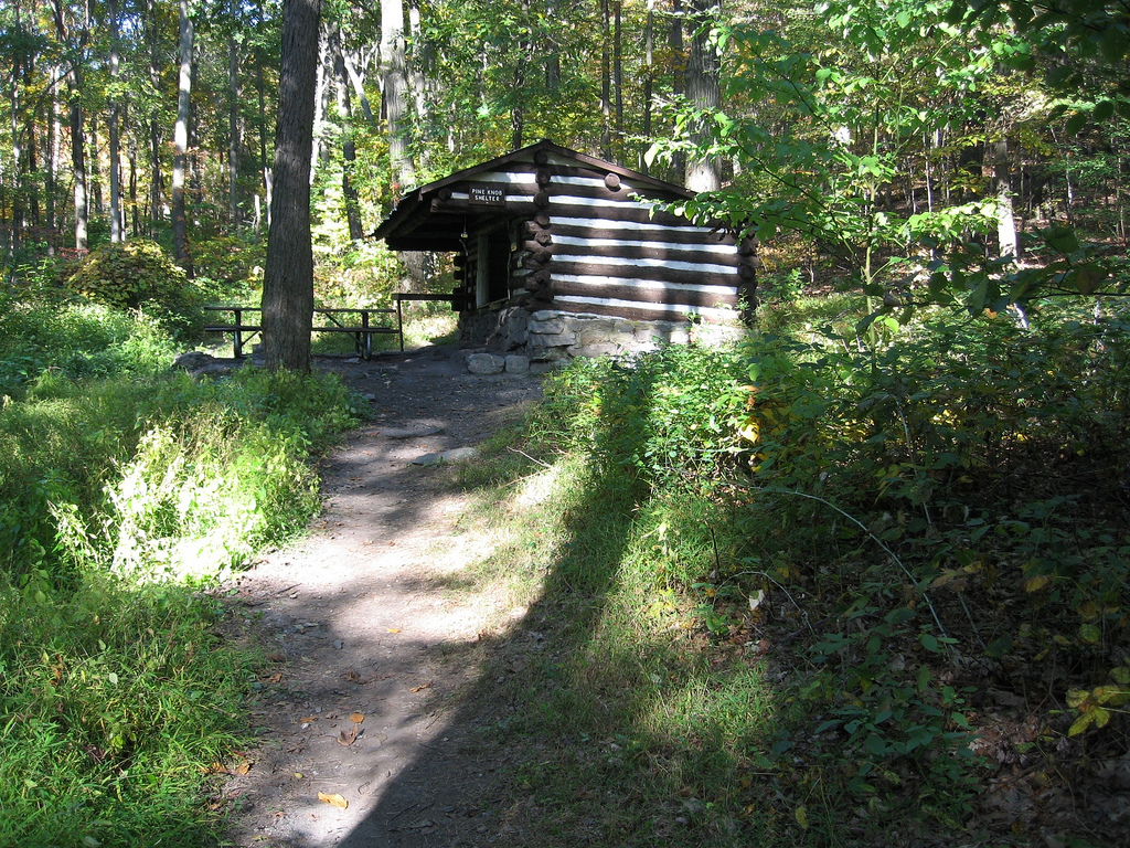 In about four hundred feet the trail turns right, leaves the busy expressway and begins to ascend. At 0.4 miles the trail bears right as the blue blazed side trail on the left heads 0.1 miles to the Pine Knob Shelter. This shelter was built in 1939 and sleeps five. There is a privy nearby and water is from a spring next to the shelter.