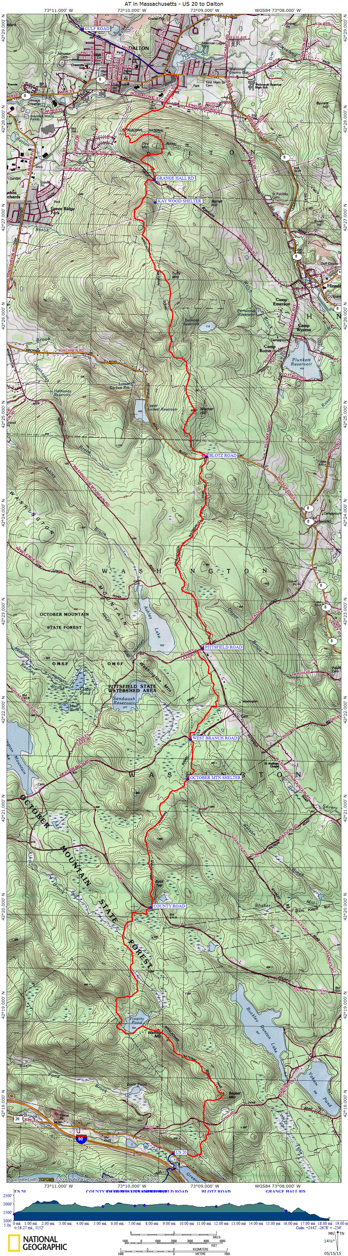 Miles from Springer Mtn Elevation Key points along the Appalachian Trail in Massachusetts 1546.8 1400 feet US 20 (Lee, MA 01238) 1547.6 1750 feet Tyne Road 1548.1 2180 feet Beckett Mountain 1549.9 1900 feet Finerty Pond 1552.2 1850 feet County Road 1552.4 2040 feet Bald Top 1554.0 1930 feet October Mountain Shelter 1554.7 1960 feet West Branch Road 1556.2 2000 feet Washington Mountain Road, Pittsfield Road (Becket, MA 01223) 1558.2 1950 feet Stream 1559.4 1850 feet Blotz Road 1560.1 2050 feet Warner Road 1562.8 1860 feet Kay Wood Shelter 1563.1 1650 feet Grange Hall Road 1565.2 1199 feet CSX Railroad 1565.8 1200 feet MASS 8, MASS 9 (Dalton, MA 01226)