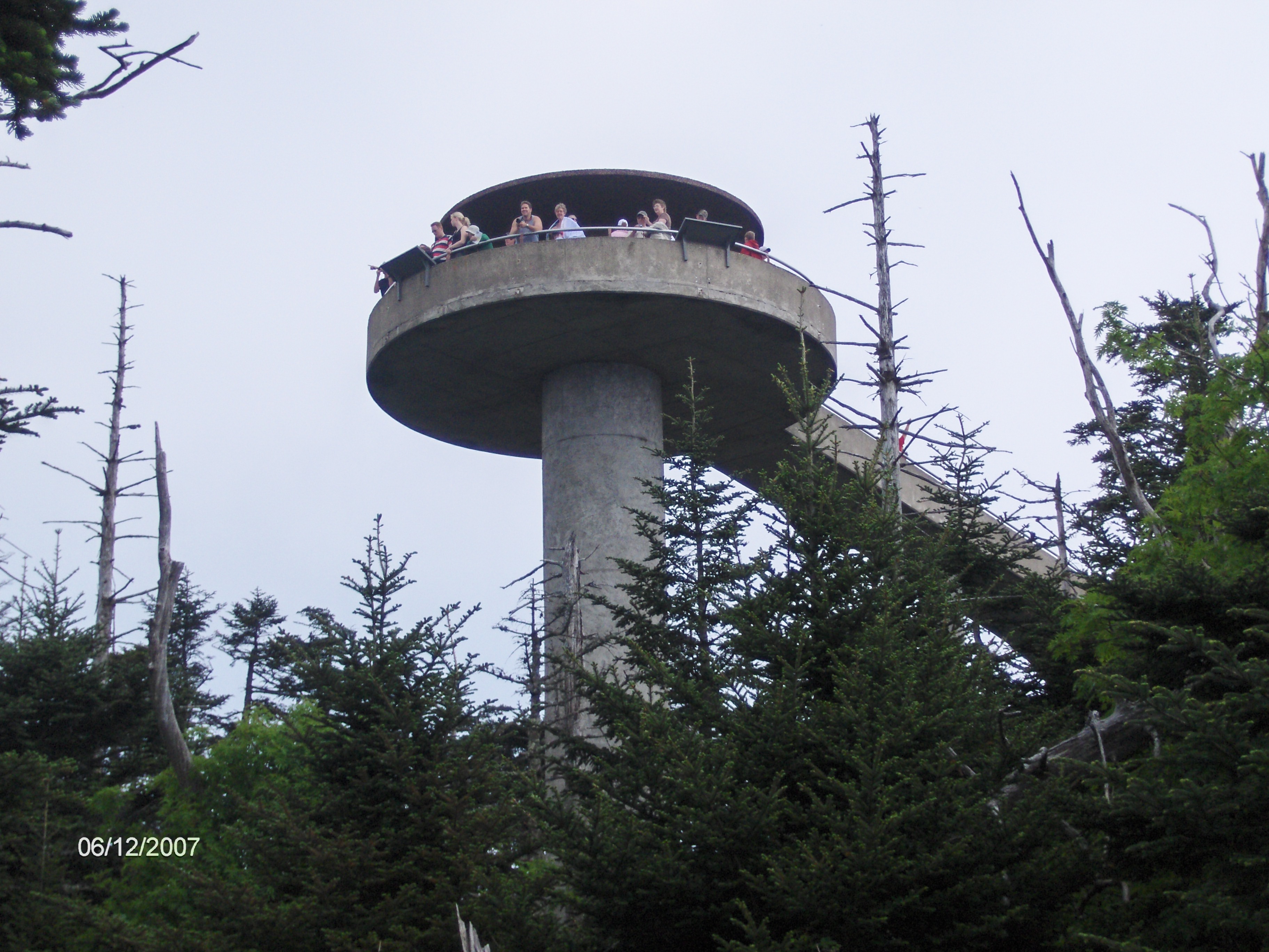 You may have already seen a few more people than you have anywhere else in the park. As you approach Clingmans Dome you'll start hear more voices. A side trail leads you to the bottom of the ramp of the observation tower, which affords 360 degree views when the mountain isn't shrouded in clouds. A bit further the trail is directly in front of the tower, which is the highest point anywhere along the whole 2180 mile AT. There is nothing to mark you are at the AT high point.