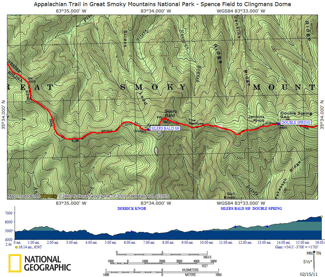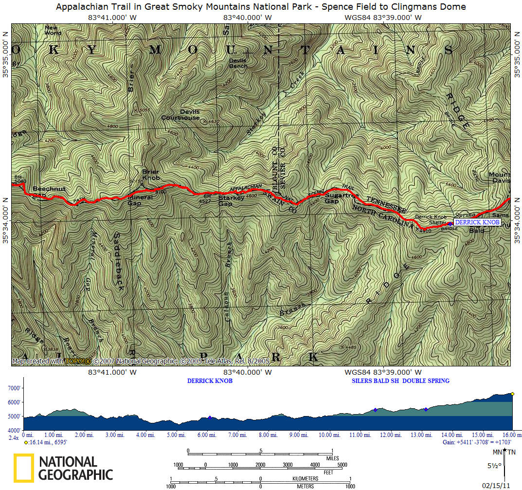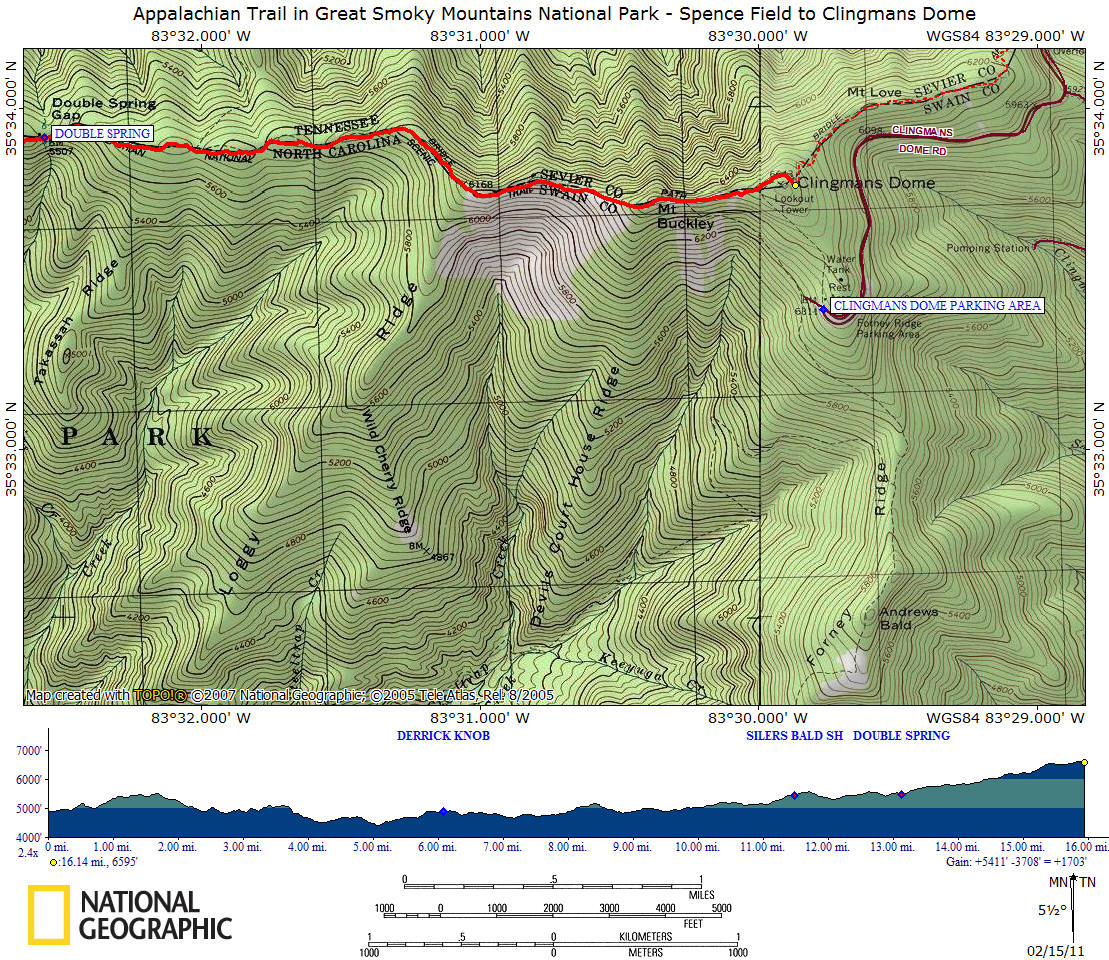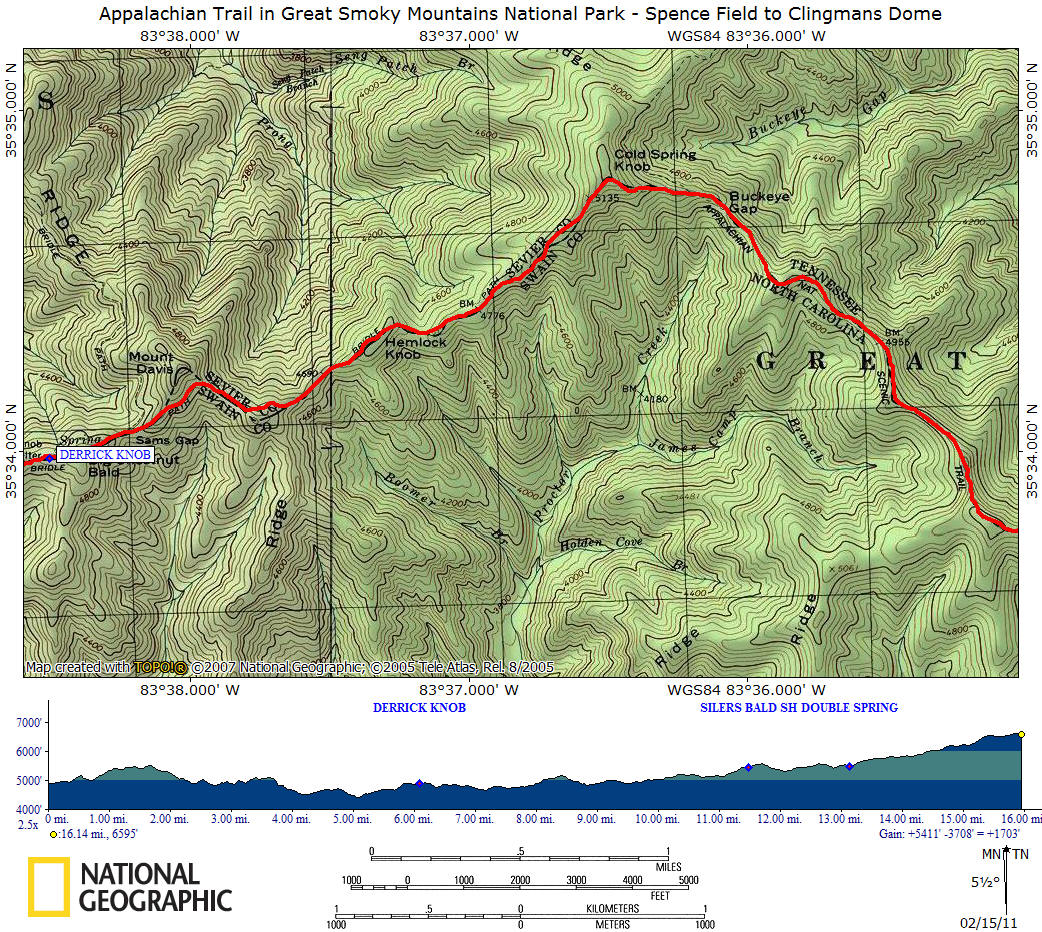 This 16.1 mile of the Appalachian Trail features Rocky Top, Thunderhead Mountain, Silers Bald, Mount Buckley and Clingmans Dome. This section includes the highest point along the whole AT, located in front of the Clingmans Dome observation deck at 6625 feet.