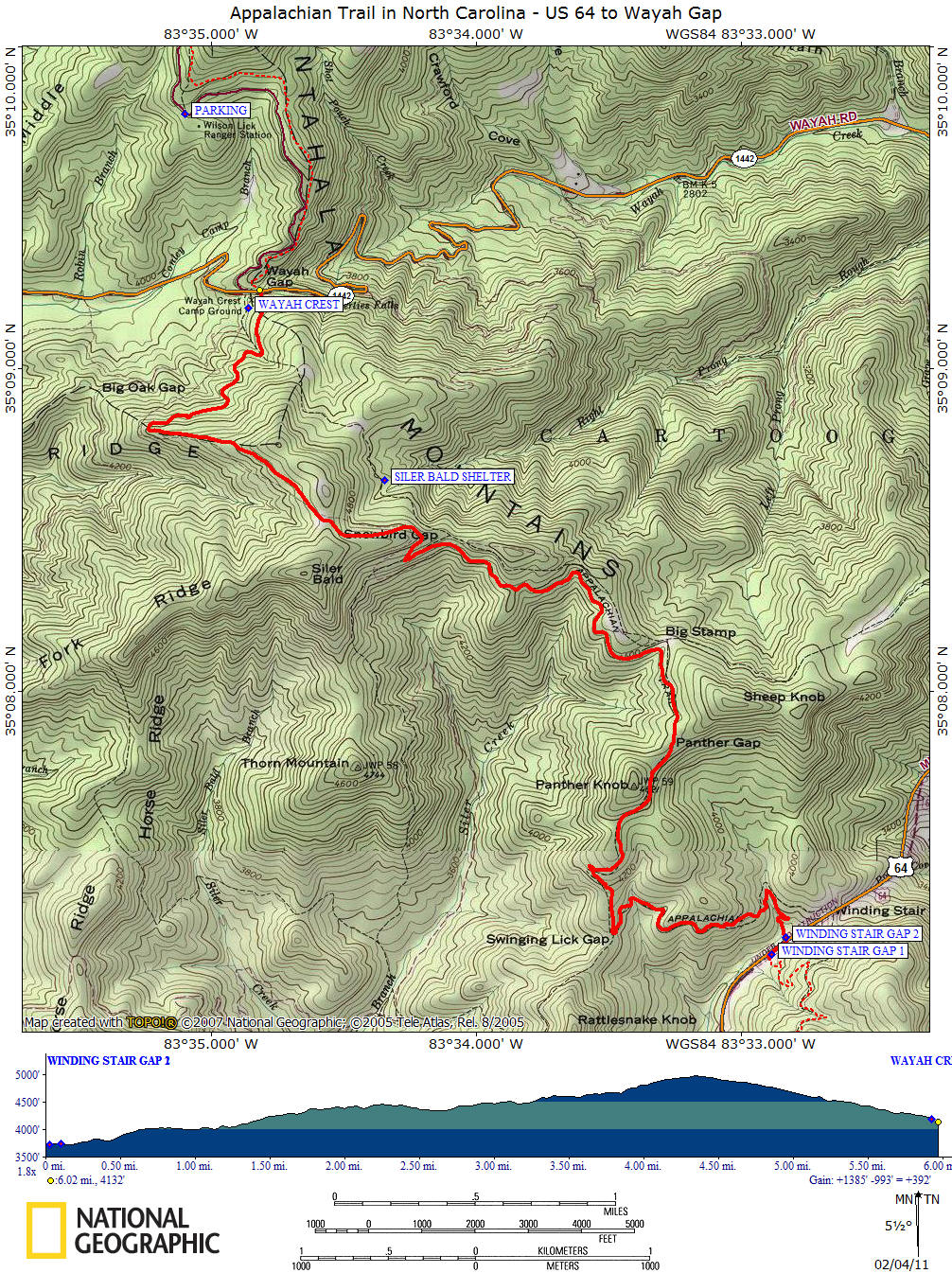 This section of the AT begins at Winding Stair Gap where the trail leaves US 64. The trail passes by a campsite at 0.9 miles and reaches 4100 foot Swinging Lick Gap at 1.2 miles. At 2.1 miles the trail passes 4383 foot Panther Gap. At 2.6 miles the trail travels near 4339 foot Big Stamp.
