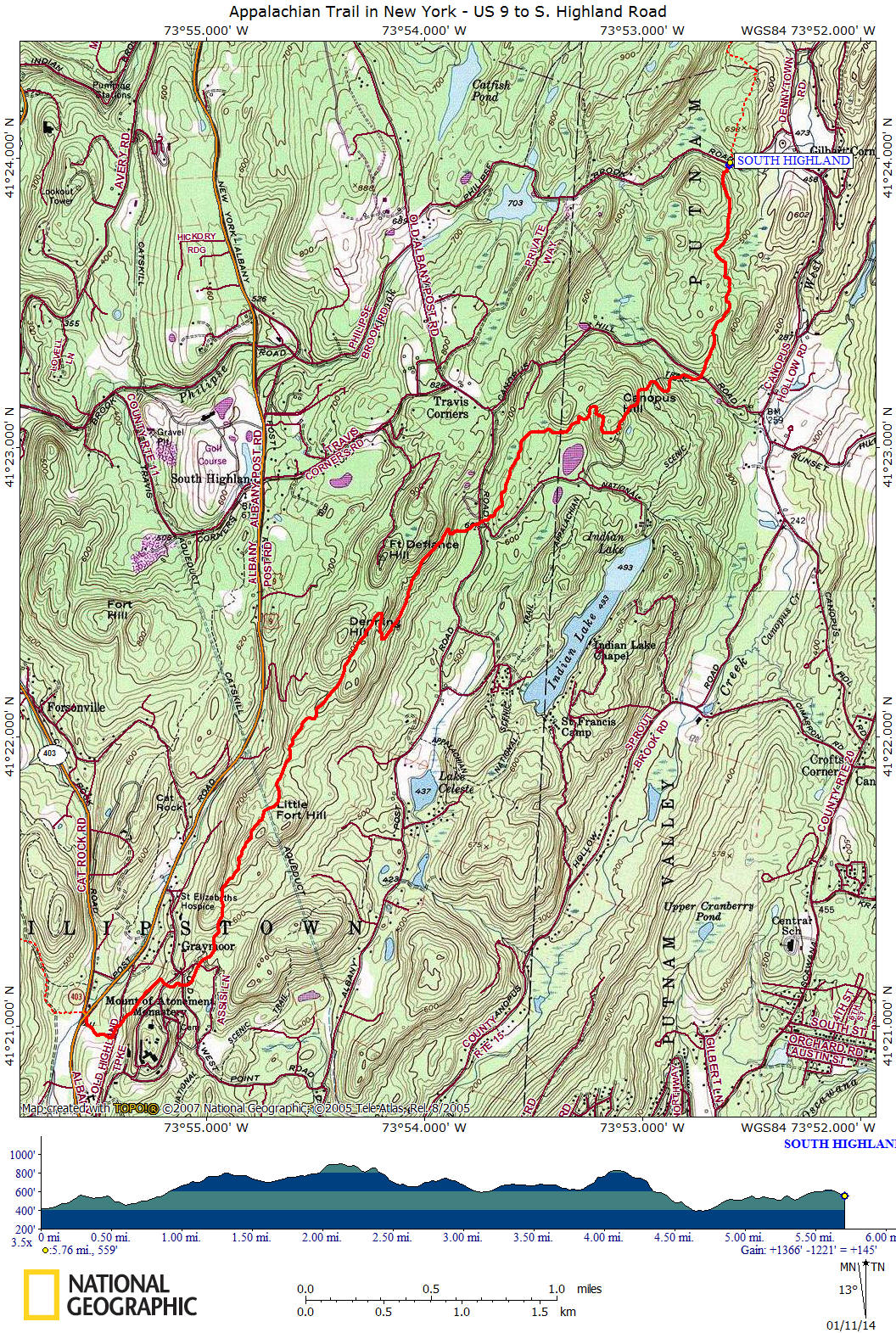 This section of the AT (heading north bound) starts as the trail crosses US 9 at the junction of NY 403. At 0.15 miles cross the Old Highland Turnpike and at 0.5 miles cross a paved road that leads to the Monastery as well as the ball field where hikers can camp. At 0.6 miles cross Old West Point Road. The trail continues to descend briefly before starting to climb 300 feet to an elevation of 798 feet on Little Fort Hill, reached at 1.3 miles. The trail descends for a bit before climbing again to a view point on Denning Hill. The trail skirts the summit, reaching an elevation of 894 feet before descending again.