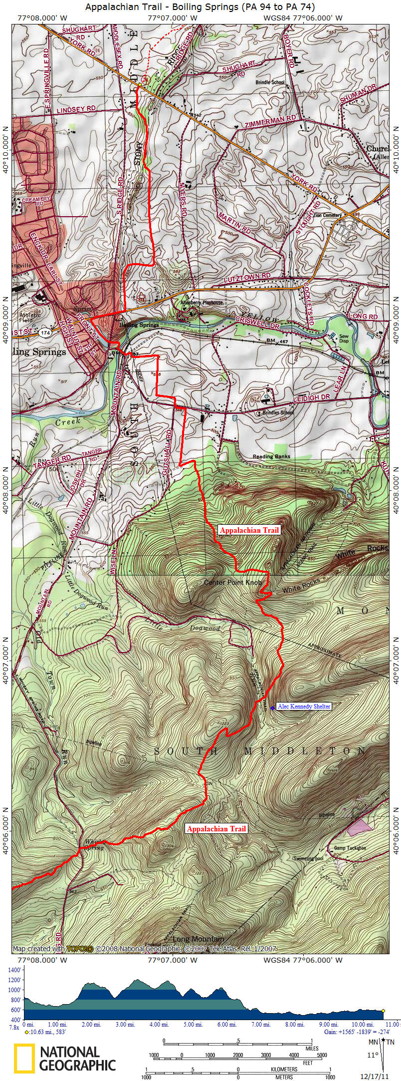 This 10.6 mile section of the Appalachian Trail in Pennsylvania features the beautiful small town of Boiling Springs. The Appalachian Trail Conservancy's Mid Atlantic Regional Field Office is located here. There is one shelter available along this stretch of trail. The Alec Kennedy Shelter was built in 1991, sleeps seven with a composting privy nearby.