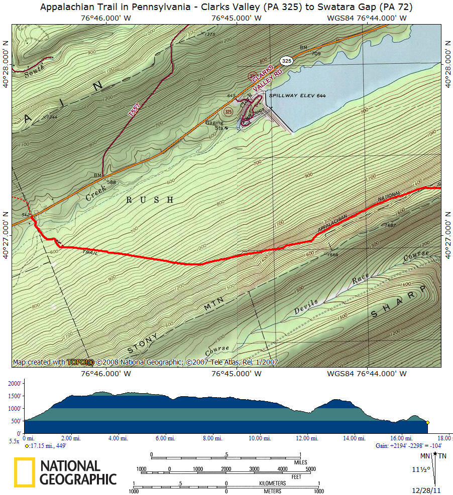 At 12.0 miles cross Haystack Creek on a wooden footbridge. At 12.8 miles reach the saddle of Second Mountain, where several unblazed trails intersect with the AT. At 15.2 miles cross Greenpoint Schoolhouse Road and then cross PA 443. At 15.8 miles reach and cross PA 443 two more times, plus a small parking lot. At 17.2 miles reach PA 72 in Swatara Gap and the end of this section of the Appalachian Trail.