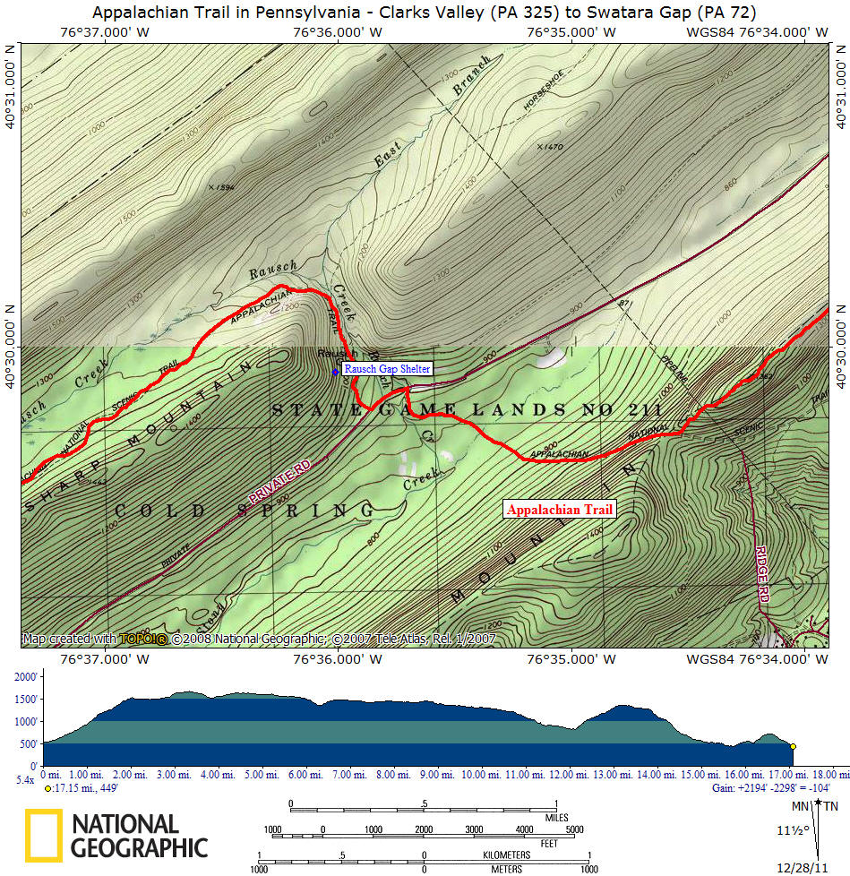 At 11.0 miles the AT bears right, leaving the old stage coach road. There is an open cut strip mine on the right and Rausch Creek on the left. At 11.2 miles reach a blue blazed trail that travels 0.2 miles to the Rausch Gap Shelter.