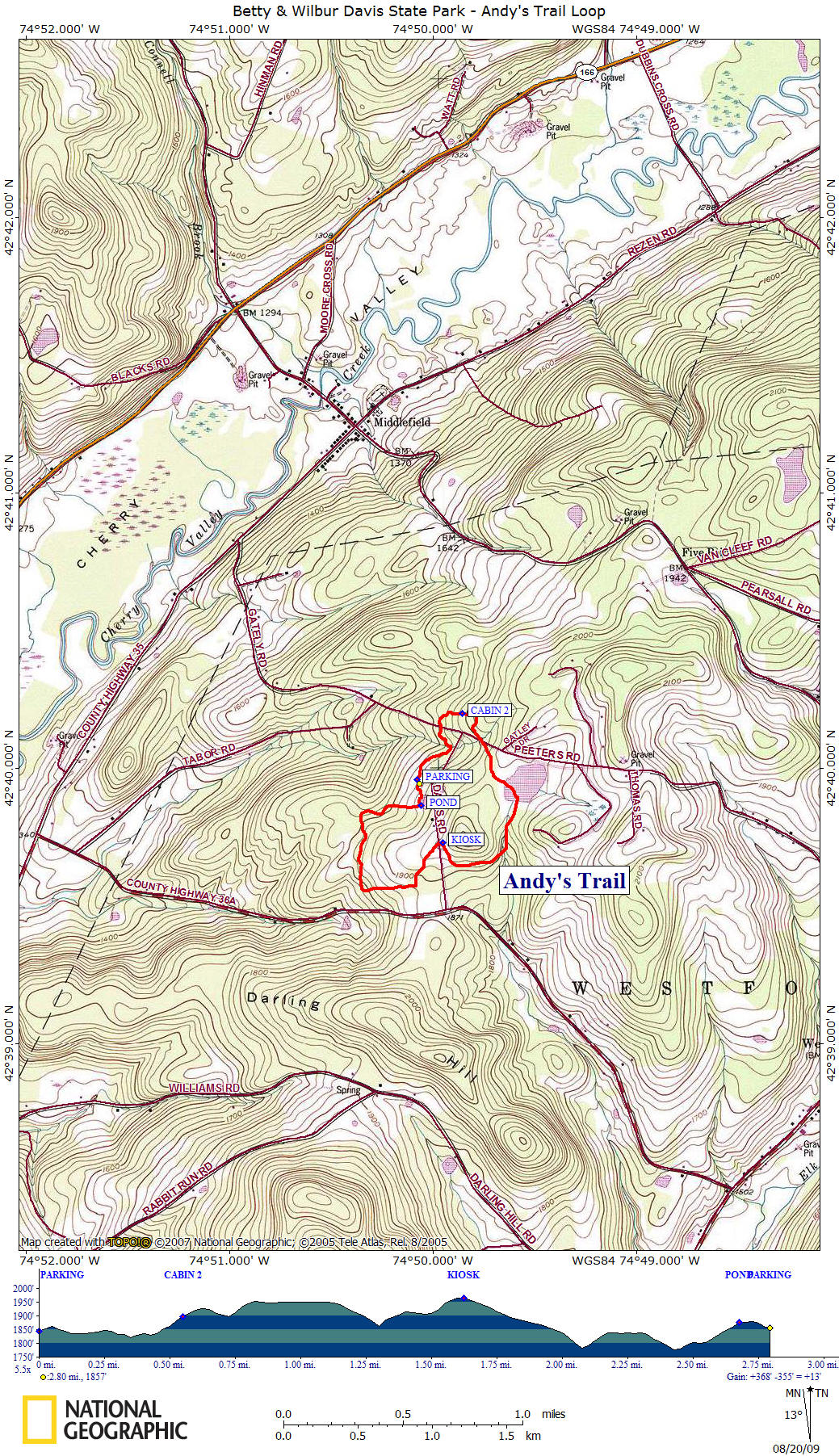 Mile Elevation Trail Description of Andy's Trail 0.0 1844 feet From the new large parking area near the rest rooms and playground head toward the park entrance road (north) then enter woods following blue NY State Park Trail discs.