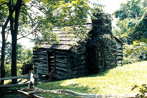 Just ahead is the Trails Cabin, reached at 1.2 miles. The cabin built in the 1890's, is perched atop a spectacular view. In fact it's "a right smart view" in the namesake vernacular of the region. Past a bench in front of the cabin, the trail continues descending and around a ridge to a stream spanned by a real nice stone bridge at 1.3 miles. The trail continues right toward a meadow beside the picnic area road, then switchbacks left into the woods. At the switchback, not far from the road a sign points back to the cabin and picnic area.