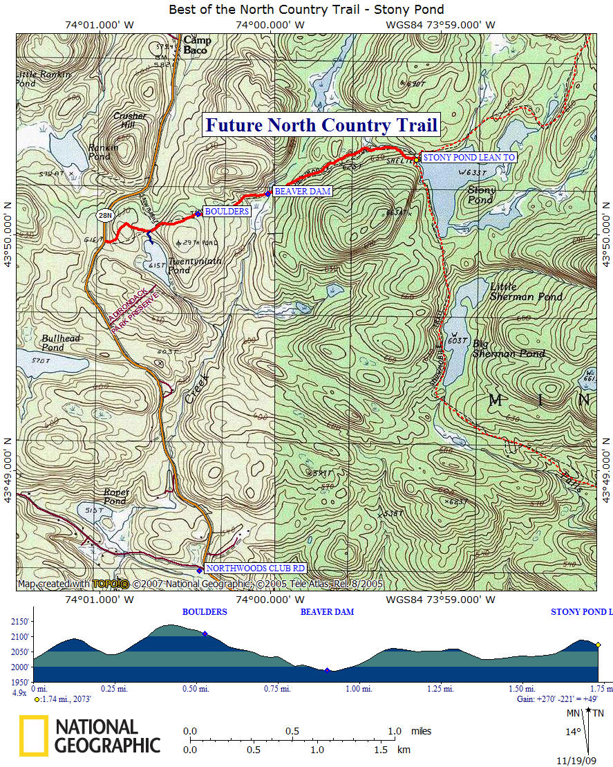 The Stony Pond Trail will be used as a "connector" for the future North Country Trail. The future NCT will use the northern branch of the Stony Pond Trail toward Hewitt Pond from the lean to. The future NCT won't go all the way to Hewitt Pond. A future trail will be built south of Barnes Pond that will bring the NCT toward Bailey Pond in Hoffman Notch Wilderness.