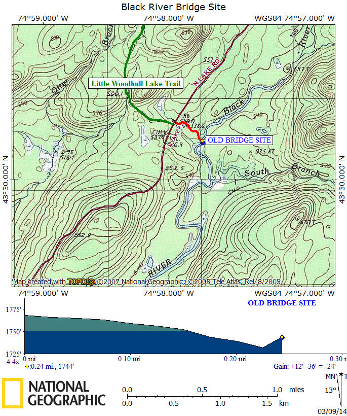 Directions: From Utica take NY 12 North to NY 28 North at Alder Creek. After crossing the Forestport Reservoir turn right off NY 28 and then right on Woodhull Road. Soon veer left on North Lake Road. Travel 13.3 miles (eventually entering Adirondack Park) to a small parking area on the right, just after the Little Woodhull Lake Trailhead. The GPS coordinates of the small parking area is N43 30.326 W74 57.940.