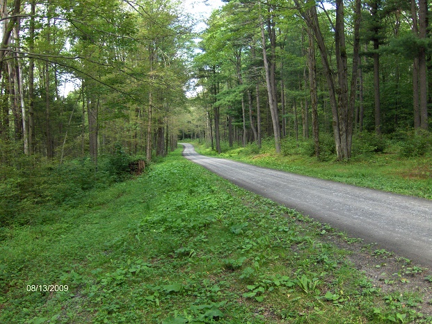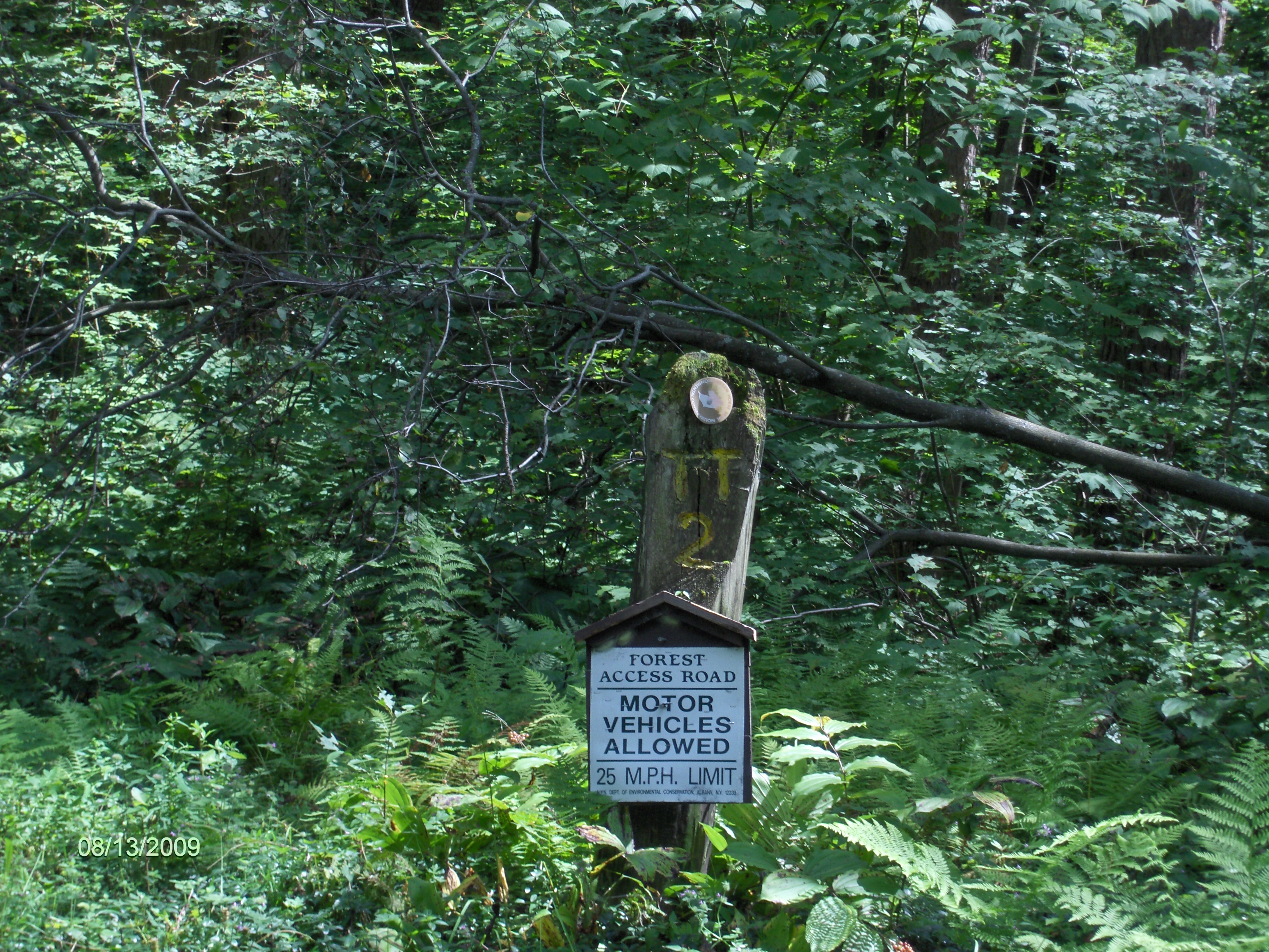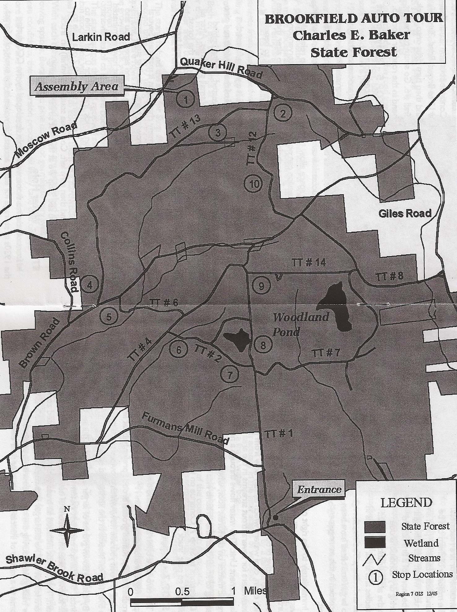 Directions to Stop #2: From the Assembly Area, turn to the right and go 0.3 miles to Quaker Hill Road. Turn right and go one mile to the intersection with Truck Trail #12. Bear right and look for Stop #2 near the Charles Baker State Forest DEC sign.