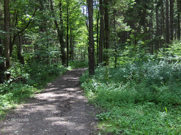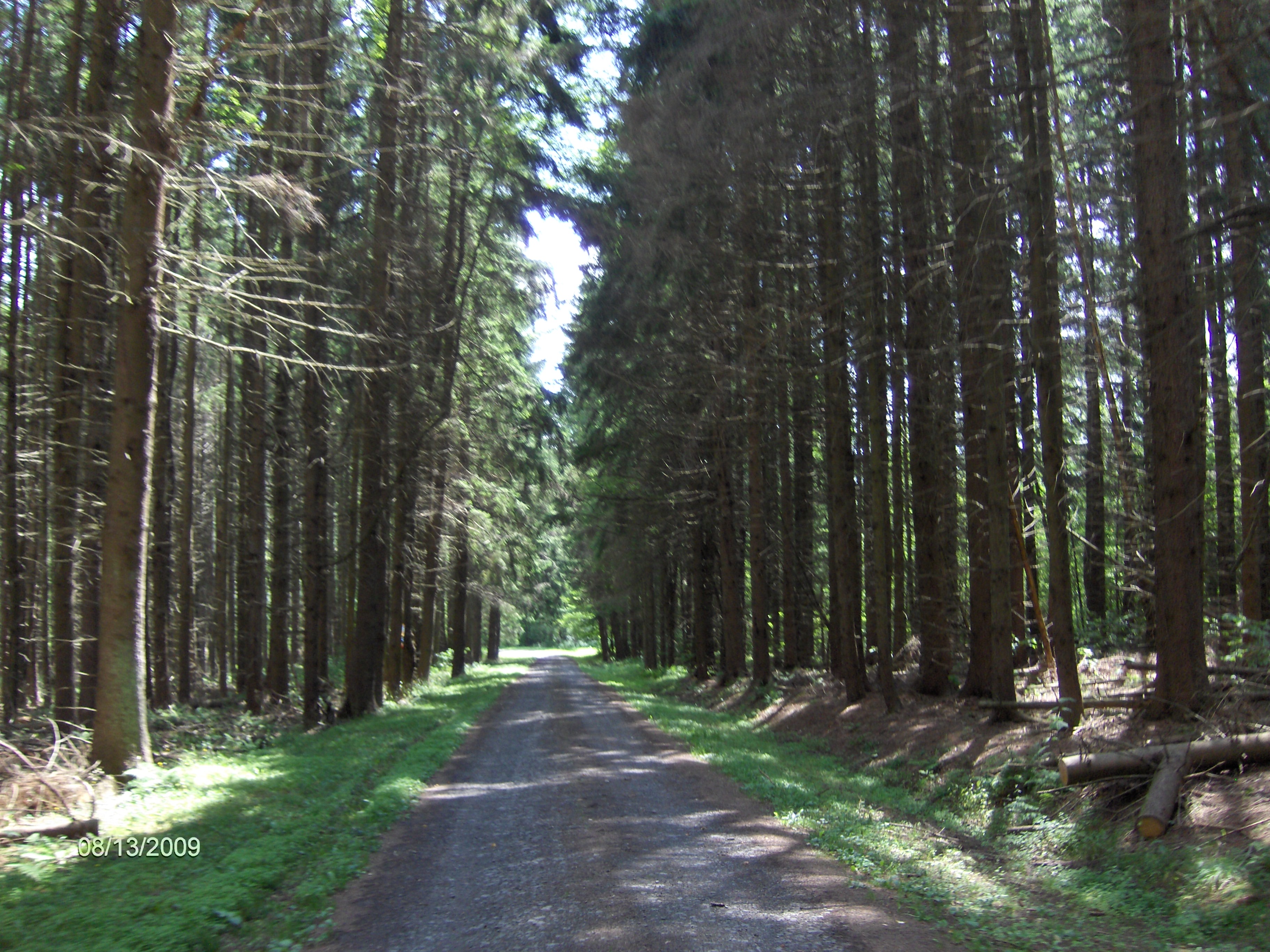 On each side of the road there is a red pine plantation. Both stands were planted in 1934 on old pasture lands. These trees grew undisturbed until the 1960's, at which time it was determined they were overcrowded and needed to be thinned out.