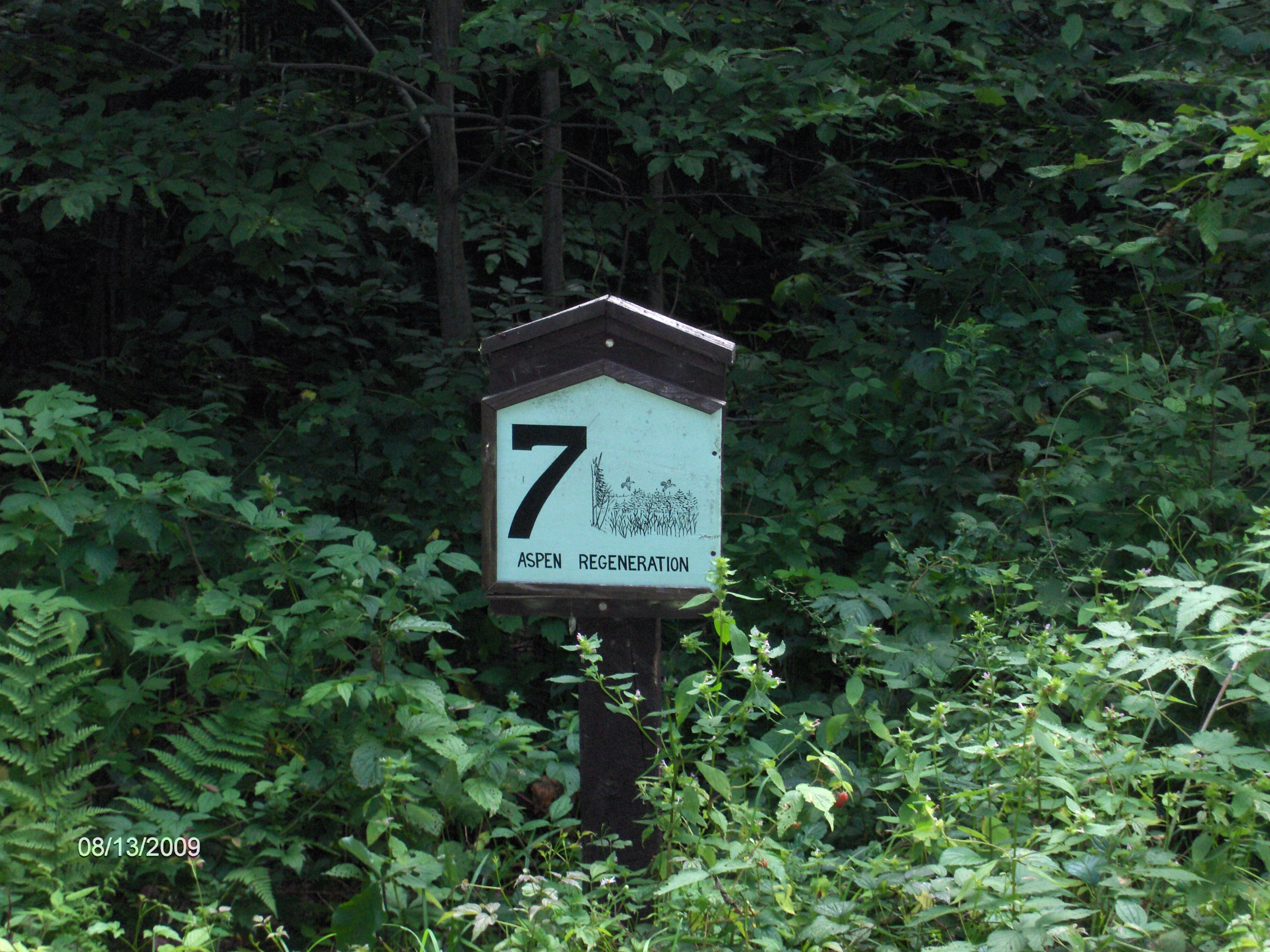 The two acre open area behind the sign for Stop #7 is one of several aspen regeneration cuts done in 1993.