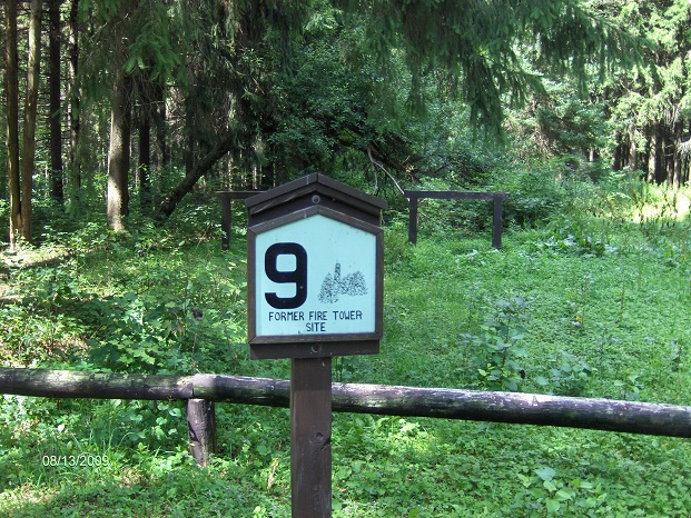 Behind the sign for Stop #9 is the site of the old Brookfield Fire Tower, which stood here from 1948 until 1983. The fire tower became a popular tourist destination, complete with picnic tables, grills, restrooms and a drilled well. At the peak of its popularity, the fire tower received more than 4000 visitors annually.