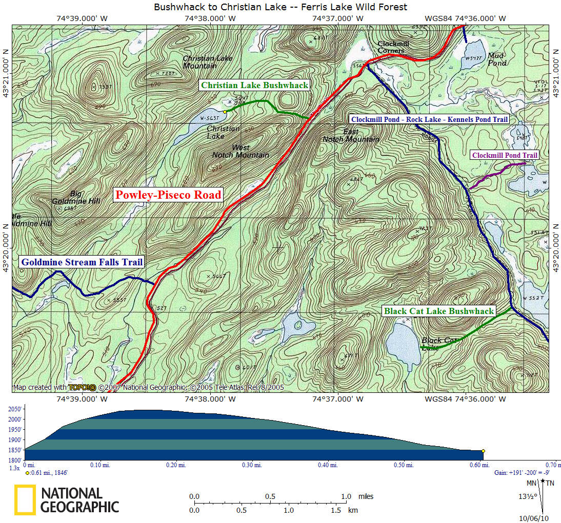 Hikers who wish to explore Christian Lake, located near the Powley-Piseco Road, normally take a herd path that is at times blocked by downed trees and pretty hard to follow. The toughest part is finding the start of the obvious herd path from Powley-Piseco Road. The start of the trail follows a seasonal stream from the dirt road about 0.6 miles south of the Clockmill Pond Trail.