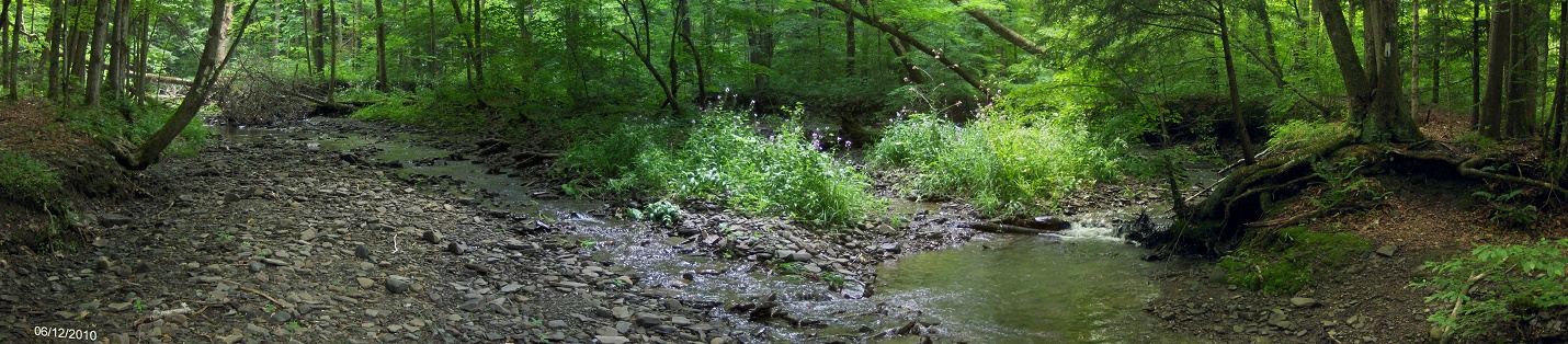 At 2.25 cross the stream. This crossing can be tricky during times of high water. The trail turns and follows the stream briefly before heading further into the woods ascending. At 2.7 miles cross a small stream. At 2.8 miles reach a blue blazed trail on your right that leads 0.1 mile to a secluded campsite. When we visited the campsite in June 2010, it looked a bit overgrown. The FLTC plans to take down the sign and black out the blazes sometime in the future.