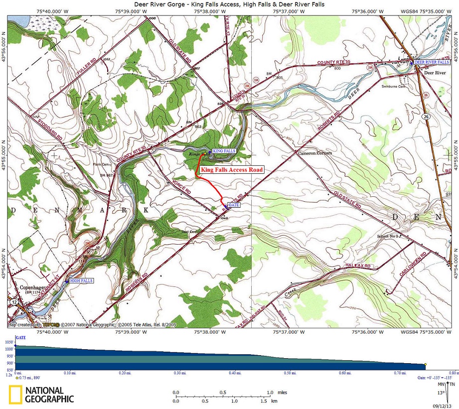 Directions: From Lowville take NY 26 north out of the village. Deer River Falls is located at the NY 26 bridge over the Deer River. The GPS coordinates are N43 55.857 W75 35.412 for those who have a GPS devise. There is limited shoulder parking on the north side of the bridge. Take Roberts Road to the King Falls access road. The unmarked road GPS coordinated are N43 54.496 W75 37.766 for those who have a GPS devise. Park without blocking the gate, there is limited parking to the left of the gate.