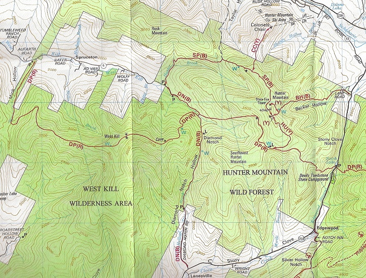 Mile Trail Description 13.80 NY 214. Stony Clove Notch. Devils Tombstone State Campground is just to the south. Cross road and stream, then begin ascent of Hunter Mountain.