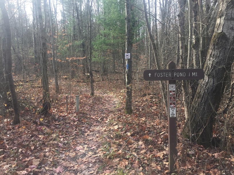 Start this hike from the Foster Pond Parking Area located near the intersection of seasonal dirt Chicken Coop Road and Potomac Road. The GPS coordinates of this parking area is N42 30.003 W76 47.396. From the parking area, head south down dirt Potomac Road (turn right from parking area) a short distance to the crossing of the blue blazed Chicken Coop Trail (aka Potomac Trail). Turn left and follow the blue blazed foot path.