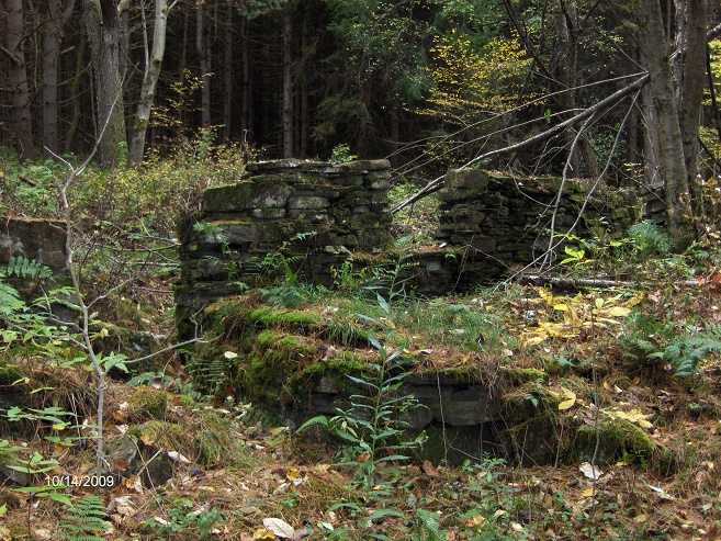 The trail has one more steep ascent up to a ridge before beginning a long, sometime steep descent toward East Branch Cold Spring Creek. The trail makes a sharp left turn during the descent and soon reaches Cold Spring Lean To on the left. The lean to was built in 1995. There are some views through the trees. This next part of the trail has numerous old walls and even a few old foundations from the folks who used to live here many years ago. The trail continues its descent and finally reaching East Branch Cold Spring Creek, crossing it on a very nice but slippery footbridge.