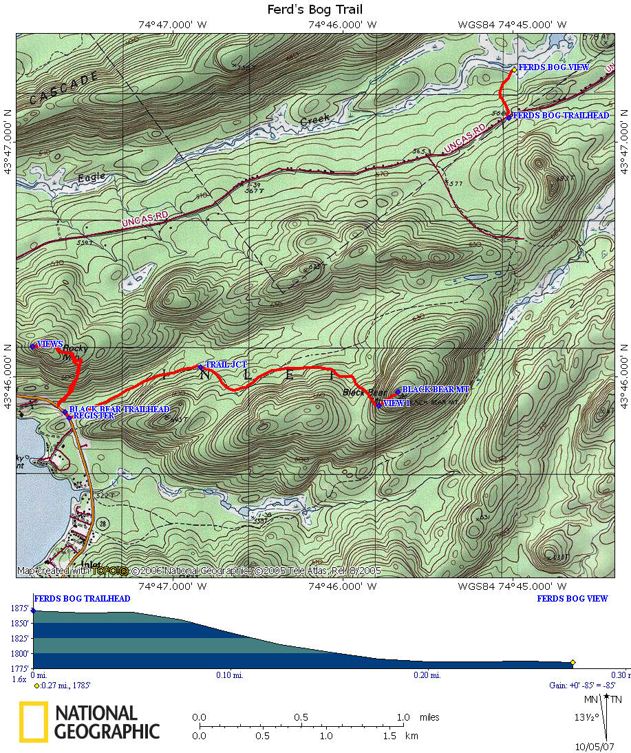 Directions: From Old Forge, NY 28 to Eagle Bay. Turn left on Uncas Road. After about 3.2 miles you will see a small parking area on the left (after the trailhead for Black Bear Mountain on the right after 2.9 miles). There is a DEC sign at the trailhead. If you're staying at Brown Tract Pond Campground, the trailhead is 3.5 miles from the campground.