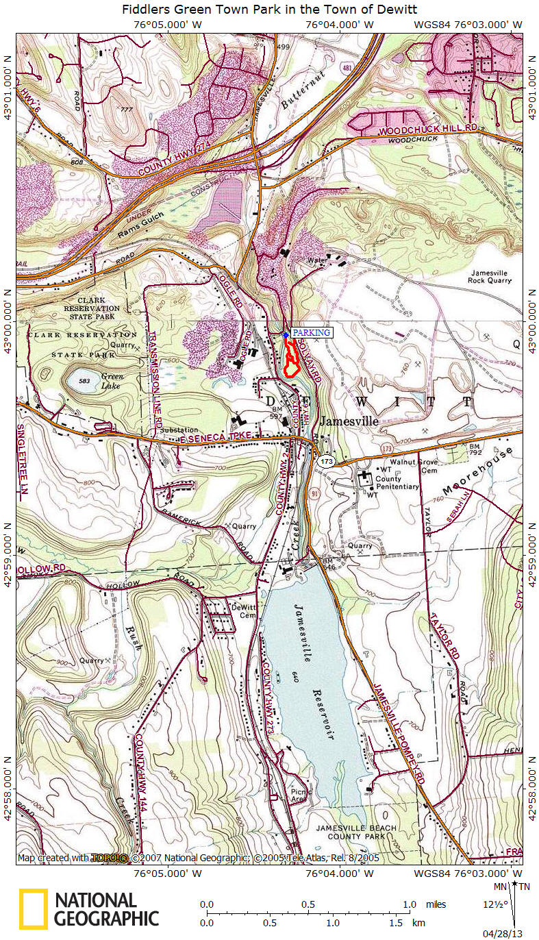 Located along a scenic stretch of Butternut Creek in the small hamlet of Jamesville in the Town of Dewitt, you'll find Fiddlers Green Town Park. The park is popular for fishing, however you can explore the well maintained hiking trails that wind along scenic Butternut Creek. Park improvements in 2009 included creating hiking trails, constructing a kiosk, adding memorial benches, picnic tables and building two small parking areas.