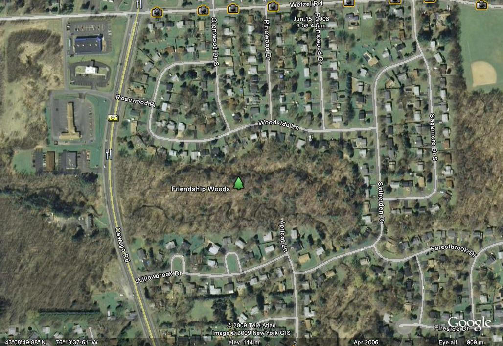 Friendship Woods Nature Preserve is bordered by busy County Route 57 (Oswego Road) on the west and the backyards of homes on the other three sides in the Bayberry Community. Those homes front on Woodside Lane, Sotherden Drive and Willowbrook Drive. The property was purchased in 1988 from the Boy Scouts of America through funds raised by CNY Land Trust and the surrounding neighbors. This preserve is 13 acres of a natural upland area full of trees, shrubs, herbaceous plants and ferns with a small stream running through the nature preserve.