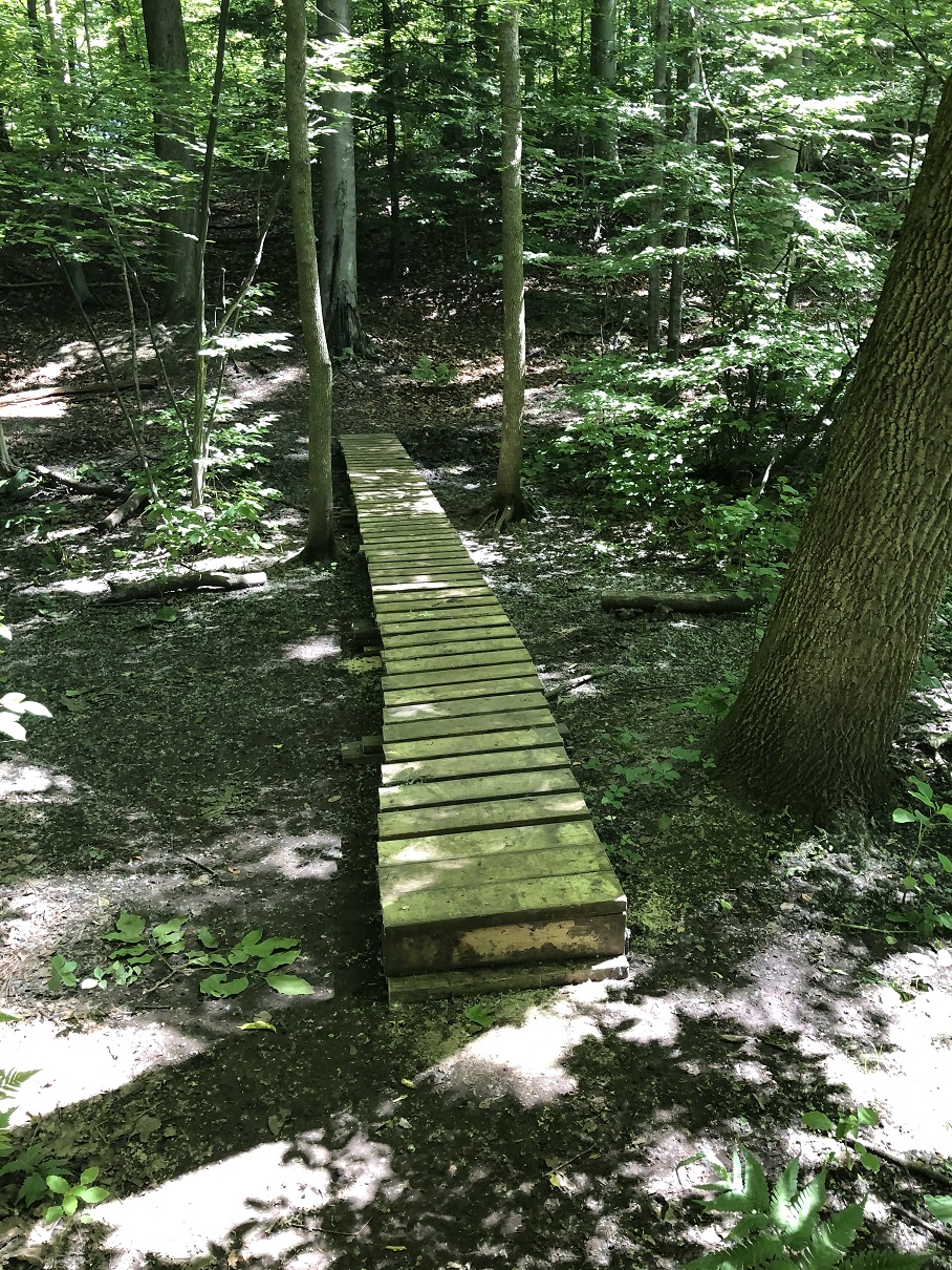 Follow the "Upper Loop Trail" until you reach another trail junction, near a wooden post (not the one one with a "6" on it, that you'll pass). The trail straight ahead meanders toward busy County Route 57. Turn left here and follow the "Lower Loop Trail". Parts of this stretch can be hard to follow, however there are white blazes on the trees to assist you in keeping yourself on the trail. Soon you'll see the familiar sight of the bridge and wood planks on your right. Turn right and head back to the end of Apricot Lane to finish your short 0.6 mile loop hike.