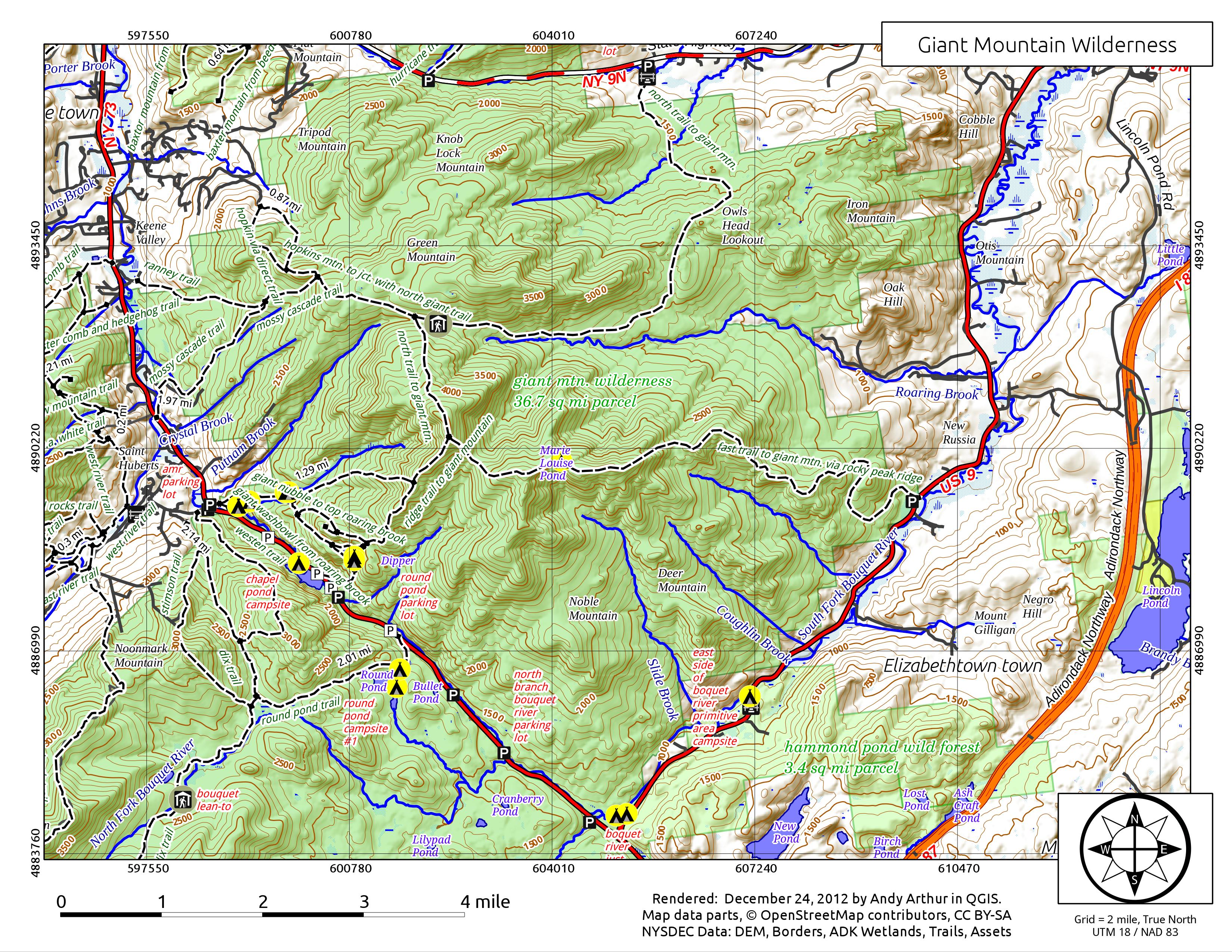 Very few people take advantage of the US trailhead for the Rocky Peak Ridge Trail. It is a long eight mile hike (one way) to Giant Mountain. Most people just hike to Bald Peak, a shorter 3.9 mile (one way) hike with a view of Rocky Peak Ridge and Giant Mountain. Even fewer people attempt hiking to Giant Mountain from the NY 9N trailhead. This 7.9 mile (one way) route passes by Owl Head Lookout and the Giant Mountain Lean To located in a col between Giant & Green Mountain. Other popular overnight destinations in the wilderness include campsites near Roaring Brook Falls and campsites near Giant Washbowl.