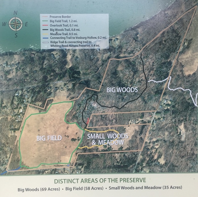 There is a large parking lot, which is located on the corner of Vosburg and Drumm Roads. The Big Field Trail is the longest of the trails at 1.2 miles. The trail goes around the perimeter of the field. The Big Woods Trail is located about 0.2 miles from the parking lot and features the old growth forest. The Meadow Trail features woods and a meadow along its 0.5 mile loop. All the travels are fairly level and are easy hikes to enjoy by all in the family.