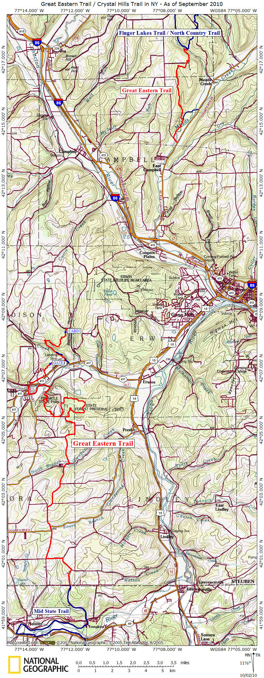 Volunteers have been building the 45 mile section of the Great Eastern Trail that will travel in New York and the section is a branch trail of the 900+ mile Finger Lakes Trail System. The FLTC has named this new branch trail the Crystal Hills Trail. Currently about 30 miles are ready to be hiked. The Great Eastern Trail enters New York at State Line Road, north of Cowanesque Lake in Pennsylvania. The GET follows the Mid State Trail in Pennsylvania.