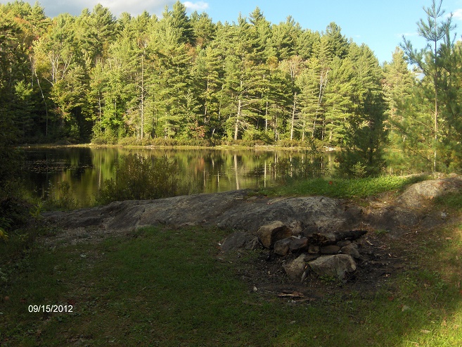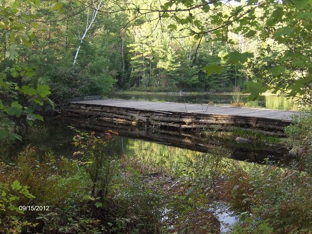 The Hammond Pond Trail continues another 0.2 miles, passing a campsite and ending at the edge of Hammond Pond. There is a spectacular view over the pond toward Bloody Mountain. On your left is the old wooden dam that keeps Hammond Pond in place. The dam has a wide wooden plank. This scenic area would be a great spot for a lean to for backpackers of the future North Country Trail.