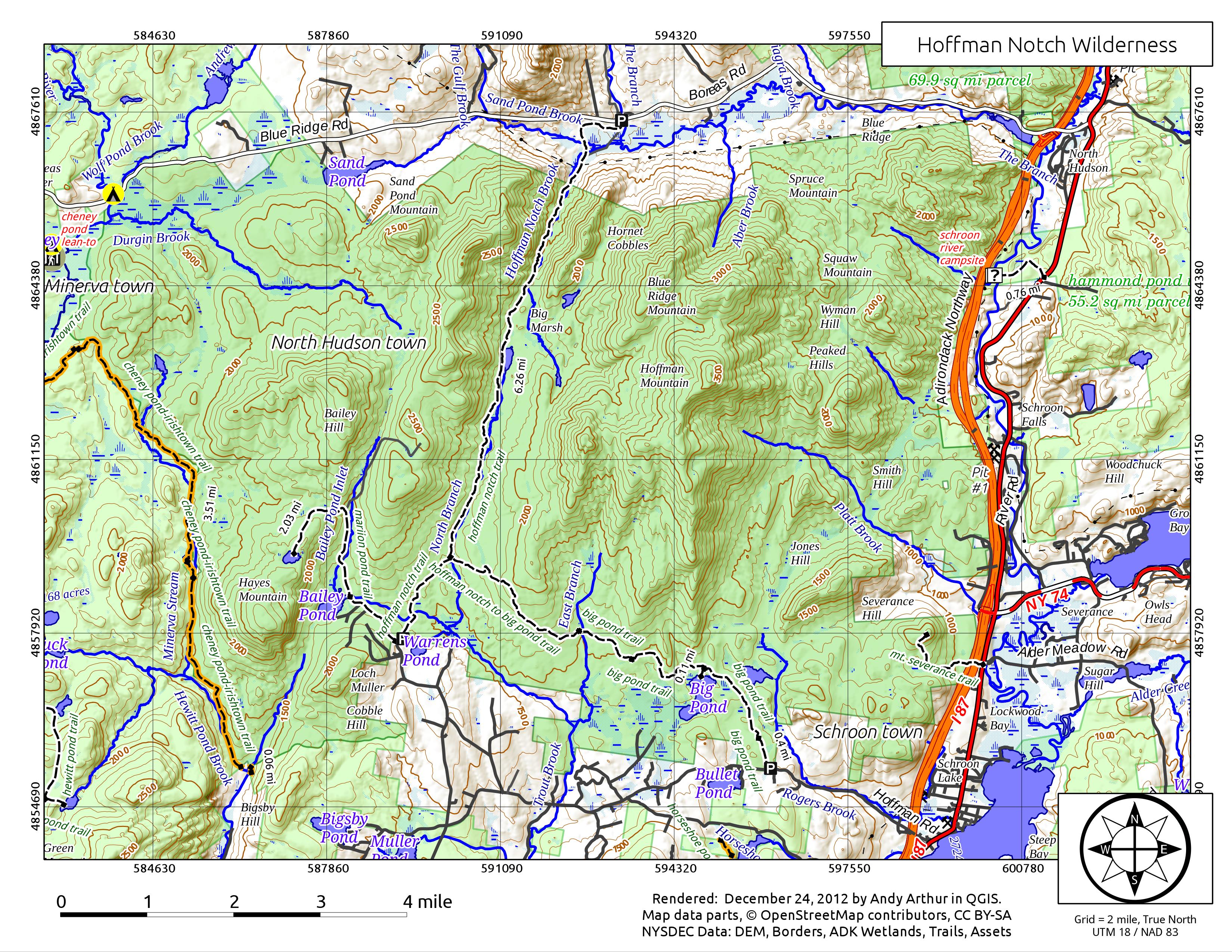 The 38,488 acre Hoffman Notch Wilderness is located in the east-central Adirondacks in Essex County. The Wilderness is bounded by County Route 2 to the north, I-87 to the east, Vanderwhacker Wild Forest to the west and Hoffman Road to the south. Hoffman Notch Wilderness is probably one of the least visited areas in the Adirondacks, which offers adventurers solitude. The future North Country Trail will travel through the wilderness.