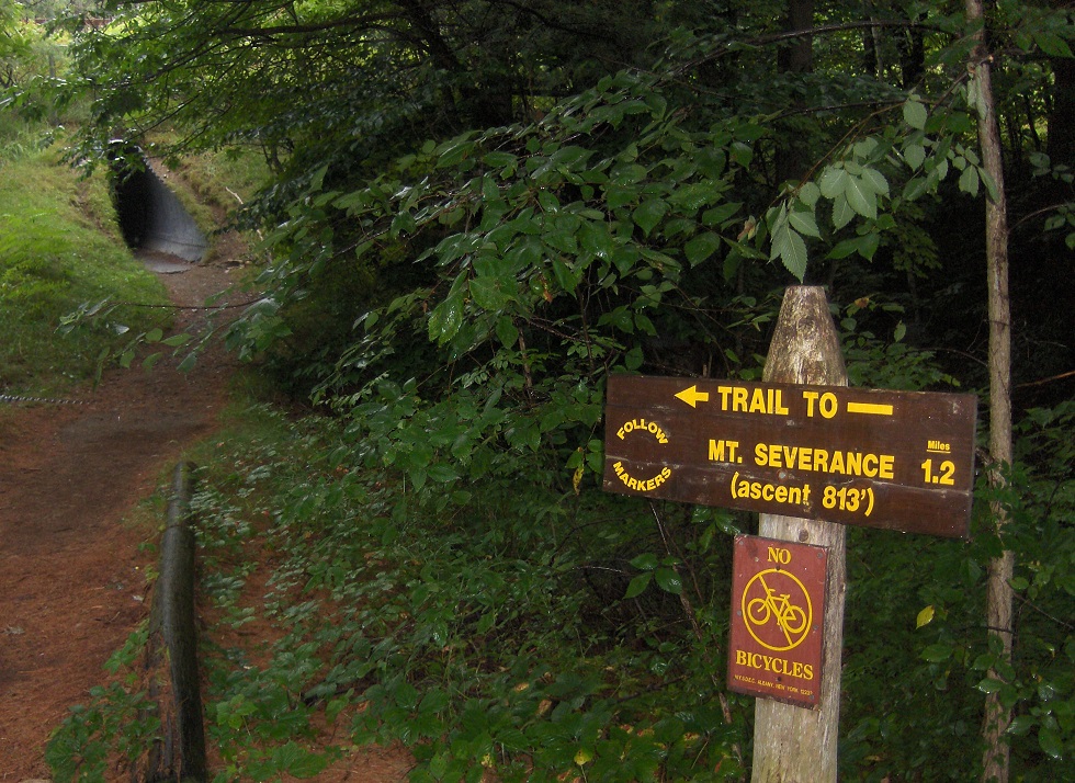 Severance Hill Trail - The 1.2 mile trail to the 1638 foot summit of Severance Hill has scenic views. The trail travels under I-87 via tunnels. The trailhead is off US 9, north of Schroon Lake.
