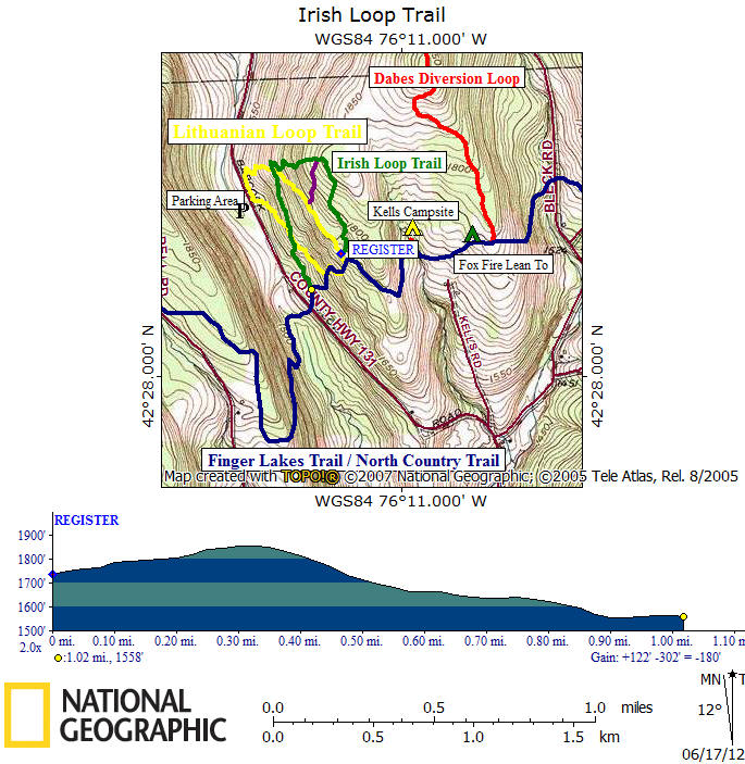 From the parking area turn right onto the western section of the yellow blazed Lithuanian Loop Trail. In 0.2 miles you'll reach a crossing of green blazed Irish Loop Trail. To create a counterclockwise loop, turn right onto the Irish Loop Trail. In 0.2 miles reach a triple green blaze of the Irish Loop Trail (end) and the junction of the white blazed Finger Lakes Trail / North Country Trail. Turn left and head uphill following the white blazes.