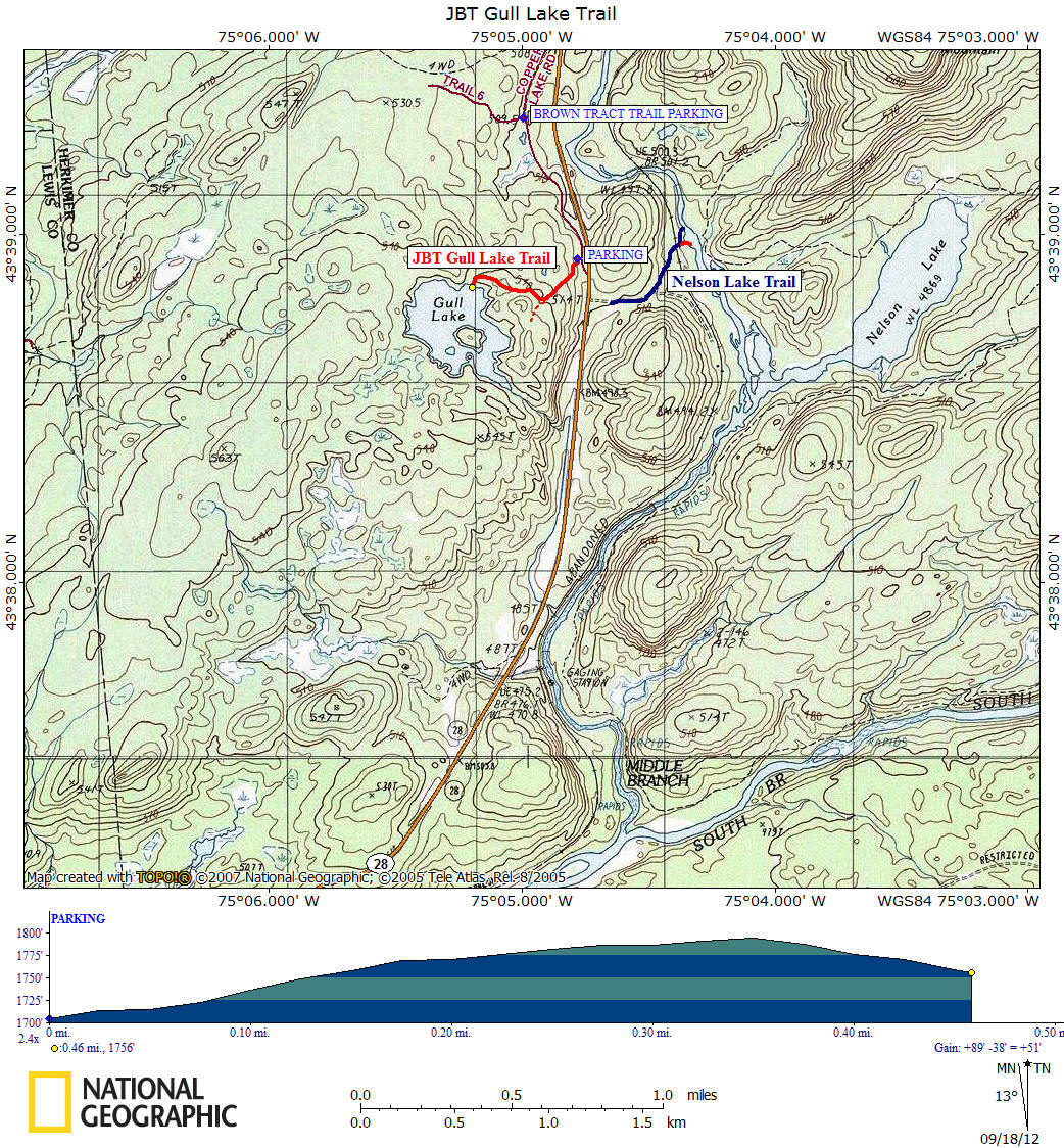 Directions: To reach the trailhead, it is about 0.2 miles from the Nelson Lake Trailhead heading toward Old Forge on the left off NY 28 nearly 2.9 miles from the Moose River bridge. There is a DEC Conservation Easement Parking sign and a large parking area just off NY 28. The GPS coordinates of the parking area is N43 38.957 W75 04.757 for those who have a GPS devise in their vehicle.