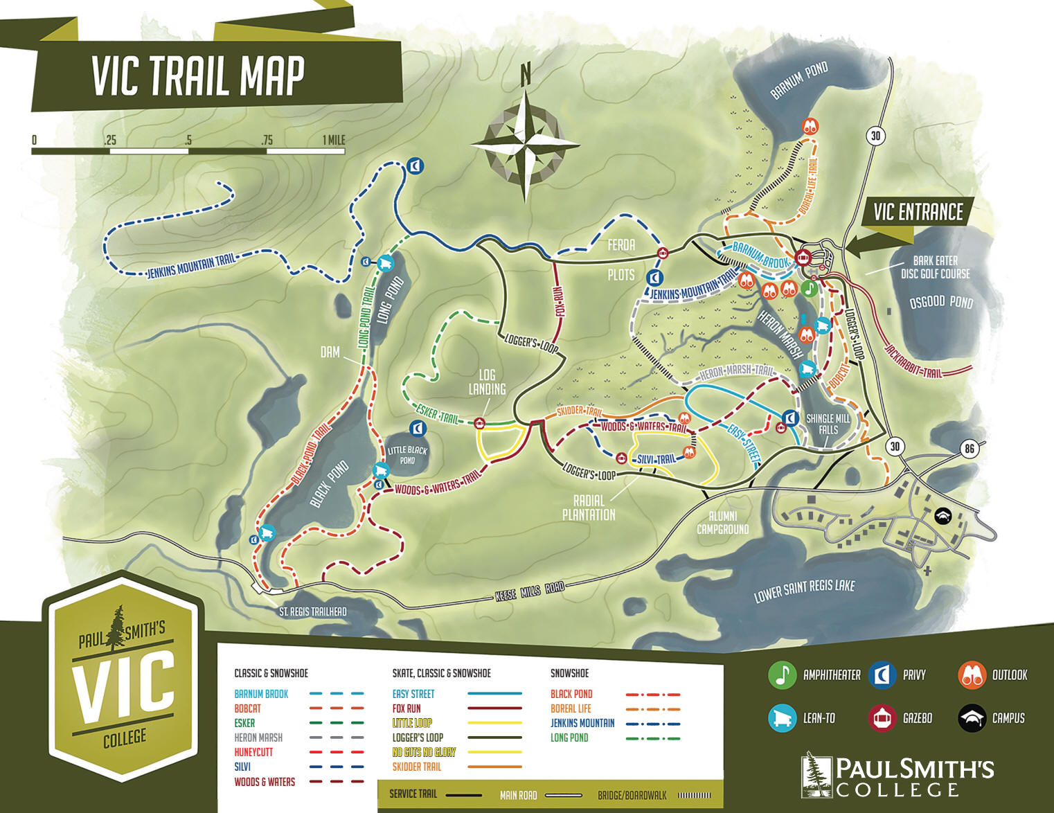 The Paul Smith's Visitor Interpretive Center features over 25 miles of trails to explore, including six miles of Nature Trails. There is a trail use fee during winter months to help pay for maintenance of grooming the XC Skiing trails. Check out the VIC website to find more info on all the trails at this great hiking destination in the Adirondacks. Look below for a current map (which you can download from the VIC website).