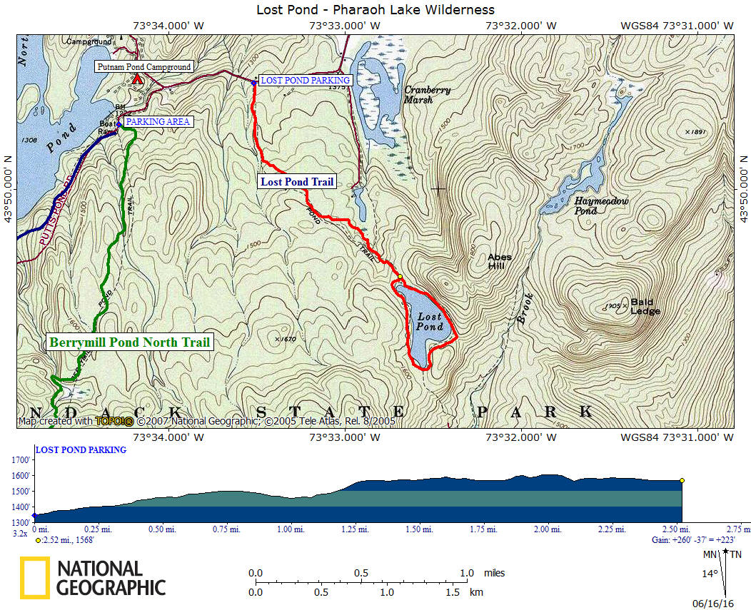 Directions: From I-87 Exit 28 take NY 74 East to the Putnam Pond State Campground Road. Turn right and follow road for about 3.3 miles, reaching the Lost Pond Trailhead parking area on the right prior to the entrance to the campground. The GPS coordinates of the parking area is N43 50.435 W73 33.517 for those who have a GPS device. There is a DEC sign near the entrance to the parking area that states 'Lost Pond 1.4 miles'.
