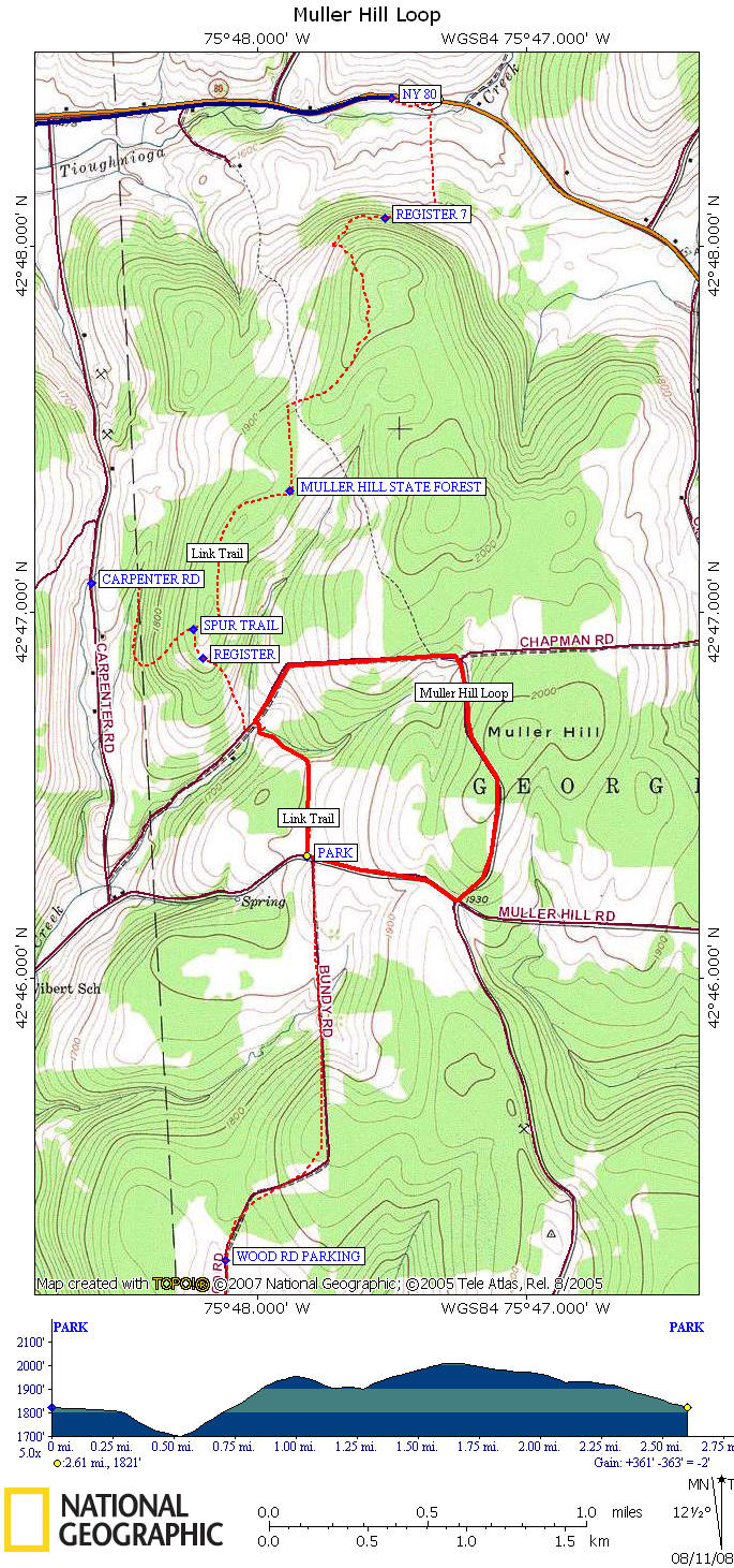 mileage elevation hike descriptions 0.0 1821 feet From Muller Hill Rd, enter forest & head north along the Link Trail. Follow the blue blazes.