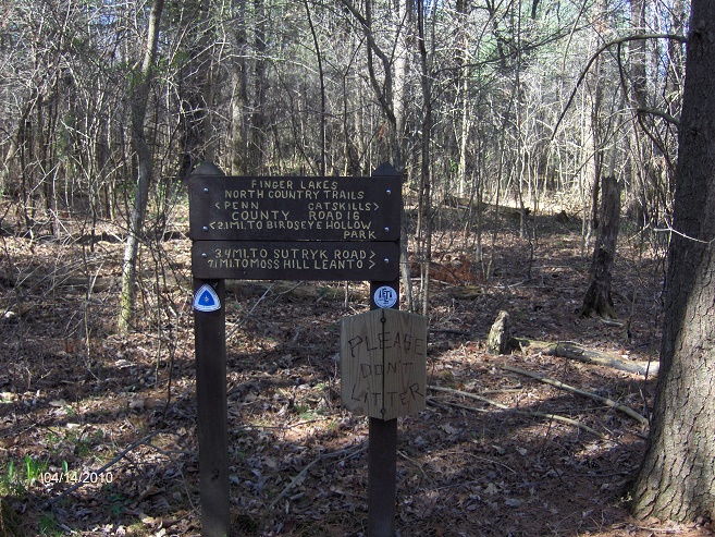The trail turns right on NY 226 then in 0.2 miles turns left off the busy highway after the bridge and reenters the woods. The trail passes Sutryk Road and leaves the state forest. You are now hiking on private property. In just under a mile the trail reaches old Bozak Road and follows the road uphill. The trail reaches County Route 18 and follows the road. Check out the view first on your right as you reach the road and then to your left as you follow the road. Now turn right on County Route 17 and then a quick left on Moss Hill Road at the Finger Lakes Trail sign. This is the end of this section. You are in the small hamlet of South Bradford.