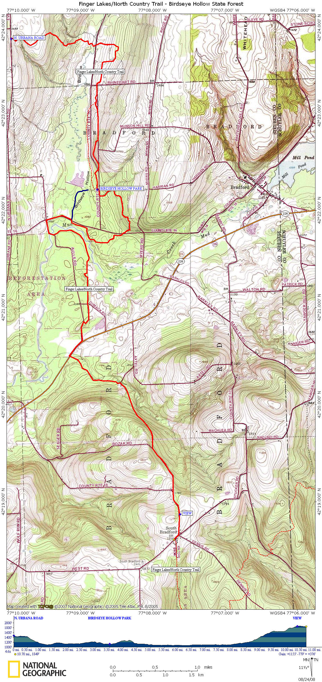 Mile Elevation North Country Trail Description 0.0 1473 feet NCT crosses North Urbana Rd and enters Birdseye Hollow State Forest.