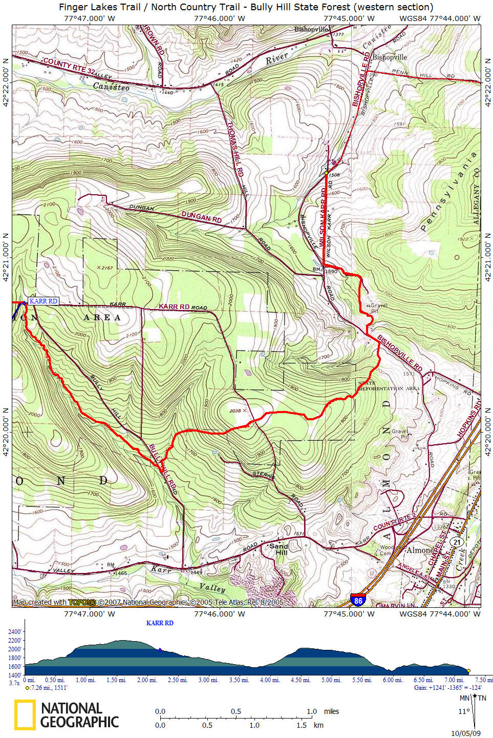 Mile Elevation North Country Trail Description (Follow white blazes) 0.0 1635 feet This section starts as the trail leaves Bush Road near seasonal road sign. Enter Bully Hill State Forest. Parking. GPS N42 21.538 W77 49.207